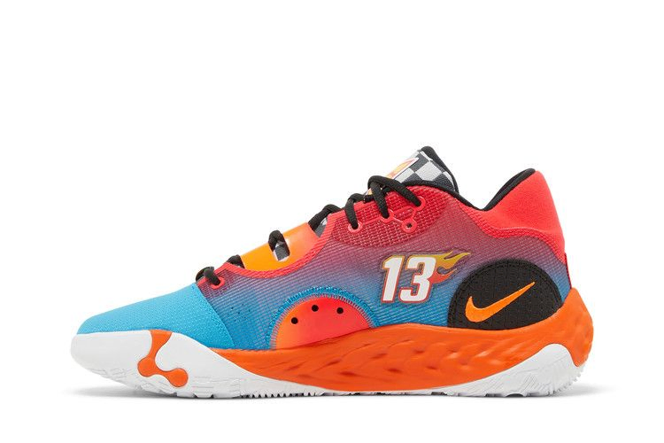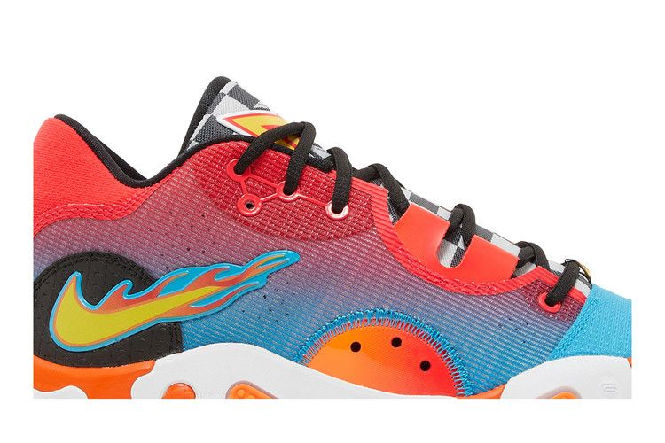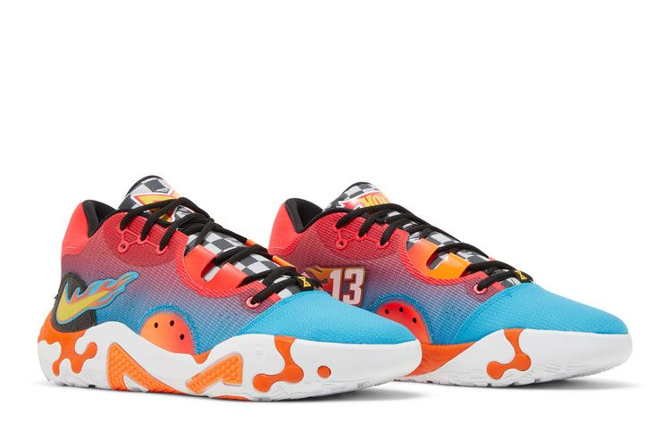 Модель Hot Wheels x Nike PG 6, разработанная совместно с компанией Mattel, представляет собой ностальгическую совместную работу, отражающую автомобильные пристрастия Пола Джорджа. Верхняя часть из дышащего текстиля, выполненная в градиентном сочетании цветов Laser Blue и Siren Red, украшена графикой в стиле гонок, включая Swoosh и номер джерси Пола Джорджа, охваченный пламенем. Язычок украшен узором в виде шахматной доски, на которой изображены несочетаемые Hot Wheels и брендинг PG. В плане характеристик кроссовки опираются на полноразмерную промежуточную подошву Nike React, усиленную хвостовиком из TPU для жесткости и поддержки при кручении.