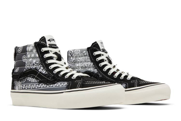 Модель INVINCIBLE x Vans Sk8-Hi Reissue VLT LX 'Gnarly Pack' представляет собой дебютное сотрудничество тайваньского ритейлера и калифорнийского скейт-бренда. Классические Sk8-Hi обновлены текстильным верхом в стиле пэчворк, украшенным различными принтами пейсли в нейтральном сочетании черного, белого и серого тонов. Черные холщовые детали на подзорной трубе, боковой полосе и пятке имеют обтрепанные края для эстетики дистресса. Кроссовки опираются на белую резиновую подошву, украшенную контрастной черной лисьей полосой, и поддерживаются подошвой из резины с вафельным рисунком.