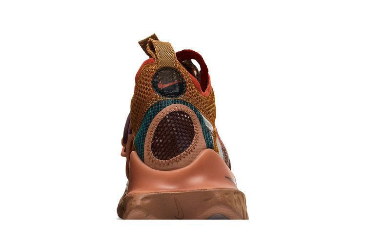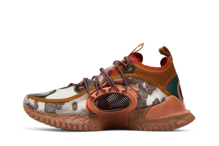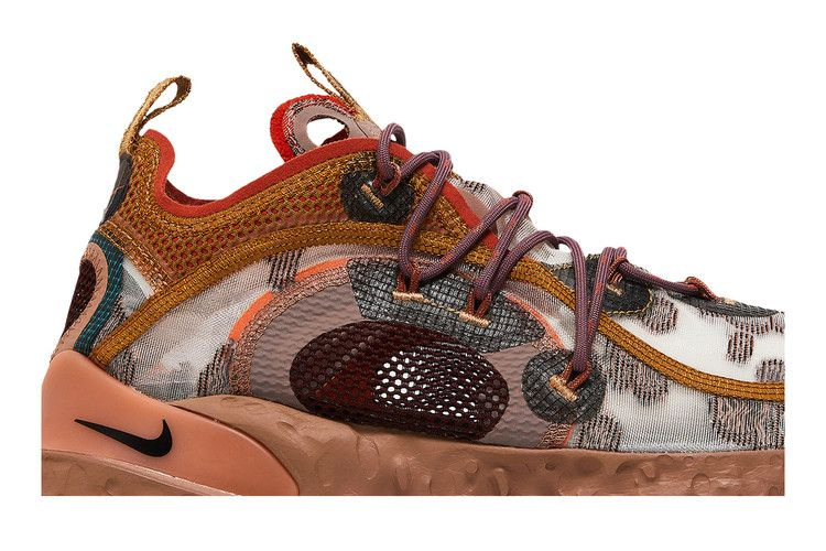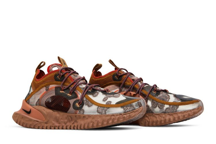 В кроссовках Nike ISPA Flow 2020 "Desert Sand" используется уникальная система шнуровки с утягивающими шнурками для фиксации верха из тканого текстиля, напоминающего носки, с вышитыми рисунками и дышащими сетчатыми панелями медно-ржавого оттенка. Незаметный брендинг включает надпись ISPA (сокращение от "Improvise. Scavenge. Protect. Adapt.") на язычке, а также черный Nike Swoosh на литом полупрозрачном TPU-клипсе пятки. Промежуточная подошва из текстурированной пены обеспечивает легкую амортизацию при каждом шаге.