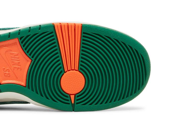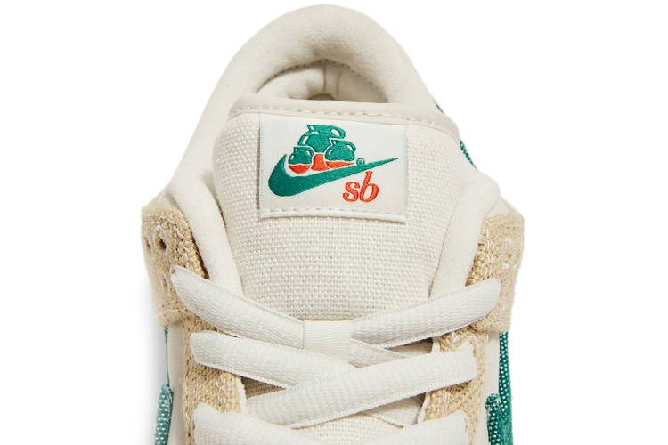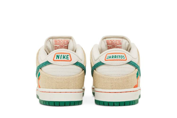 Jarritos x Nike Dunk Low SB отличаются уникальным дизайном, в основе которого лежит популярный мексиканский безалкогольный напиток. Низкие кроссовки выполнены из белой кожи и украшены накладками из рваного холста на носочной и пяточной частях. Вдохновленные холщовыми мешками, используемыми для сбора фруктов, которые придают напитку разнообразные вкусы, накладки и зеленый холщовый Swoosh открывают скрытую замшевую основу цвета Safety Orange. Вышитая графика Jarritos украшает боковую пятку, а на каждом язычке пятки красуется несовпадающий брендинг Nike и Jarritos. Эта пара поставляется в специальной упаковке: холщовый мешок для пыли и фирменная коробка в деревянном ящике. В сопроводительной коробке находятся фирменные бутылки Jarritos с четырьмя разными вкусами.