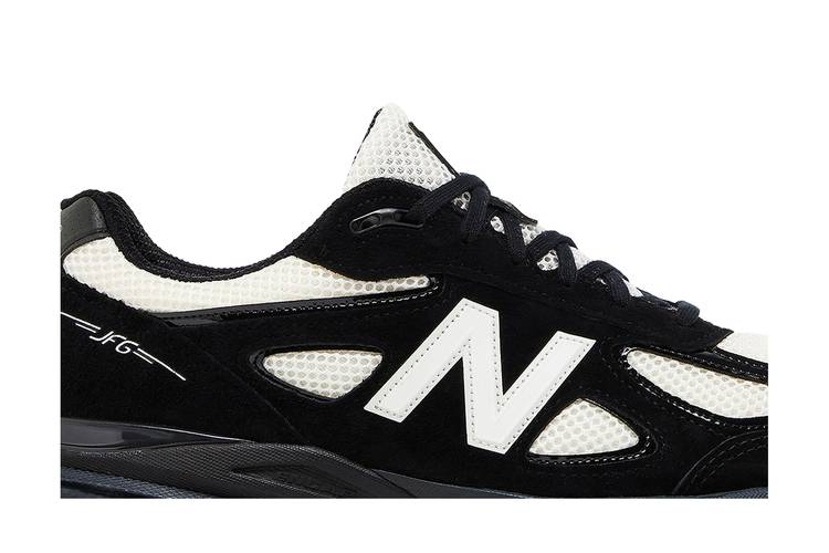 Модель Joe Freshgoods x New Balance 990v4 Made in USA 'Outro', выпущенная в рамках совместного проекта '1998 Pack', представляет собой ретро-кроссовки, выполненные в актуальной двухцветной палитре. Верх из воздушной белой сетки с контрастными черными замшевыми накладками и отделкой из лакированной кожи. Белый логотип "N" украшает задник, а надпись "JFG" нанесена на боковую часть пятки. Легкая амортизация обеспечивается промежуточной подошвой ENCAP, окрашенной в черный цвет и состоящей из мягкой пены и прочного полиуретанового обода.