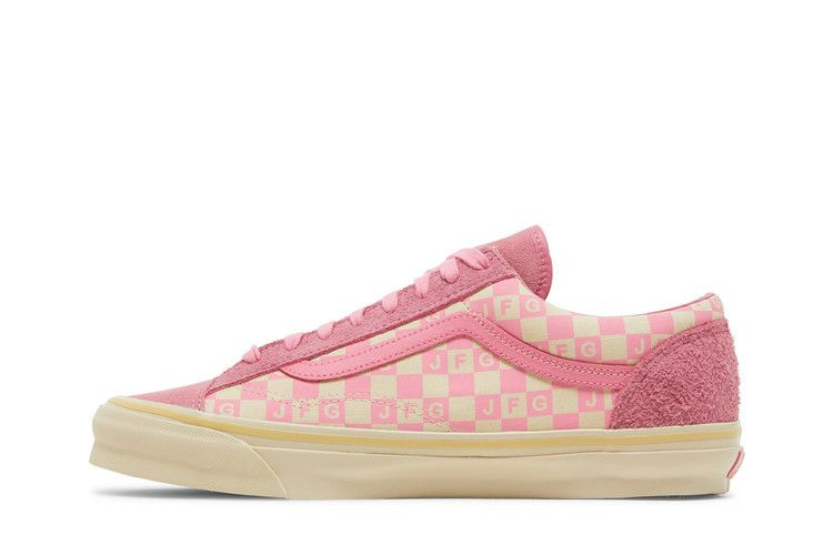 Модель Vans OG Style 36 LX "Pink", выпущенная в рамках коллекции "Honeymoon Stage" дизайнера из Чикаго, представляет собой классический силуэт в пастельных тонах. Верхняя часть сочетает розовые замшевые накладки с воздухопроницаемой канвасовой основой, покрытой розовой кожаной боковой полосой и брендингом JFG, интегрированным в розово-белый клетчатый принт. Кроссовки стоят на резиновой подошве Marshmallow, украшенной желтой лисьей полосой и розовым номерным знаком Vans.