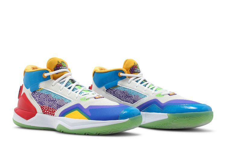 Модель Jolly Rancher x New Balance KAWHI 'Original Flavors', выпущенная в рамках совместной коллекции, посвященной любимым конфетам детства Каухи Леонарда, выполнена в смешанной цветовой гамме и украшает верх кроссовок из воздухопроницаемой сетки. На подкладке язычка надпись "Kawhi Leonard" наложена на графику с изображением фруктовой банды Jolly Rancher. Персонажи повторяются на носочной стельке, а полупрозрачная резиновая подошва раскрывает дополнительные цвета под ногами.