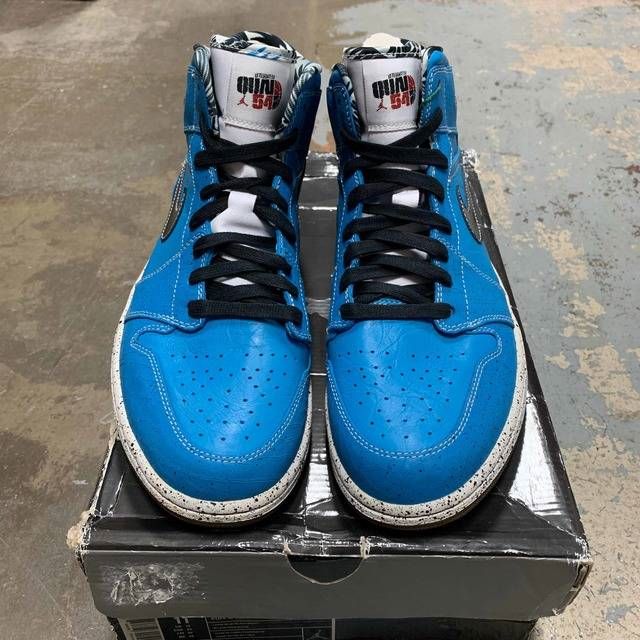 Заказать поиск кроссовок Jordan 1 Retro Quai 54 Ruff N Tuff с бесплатной доставкой. Хай-топ версия Ruff N Tuff x Air Jordan 1 Retro была разработана для празднования стритбольного турнира Quai 54. Дизайн отличается потрескавшимся кожаным верхом ярко-синего цвета с черными кружевами и черными лакированными кожаными вставками. Другие детали включают специальную маркировку язычка Quai 54, графический вкладыш, пеструю мидсоль бетонного цвета и ледяную полупрозрачную подошву.