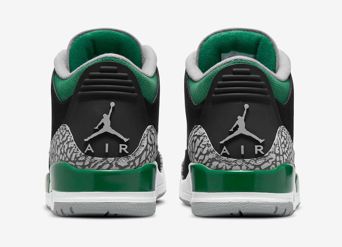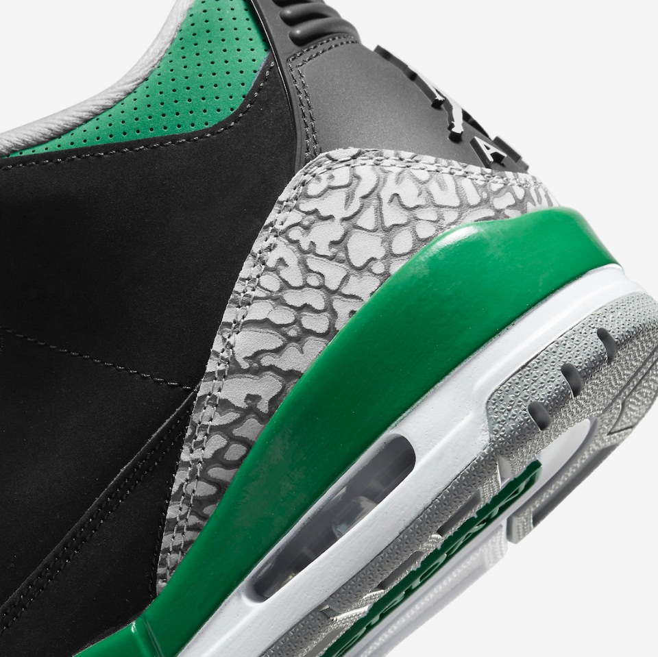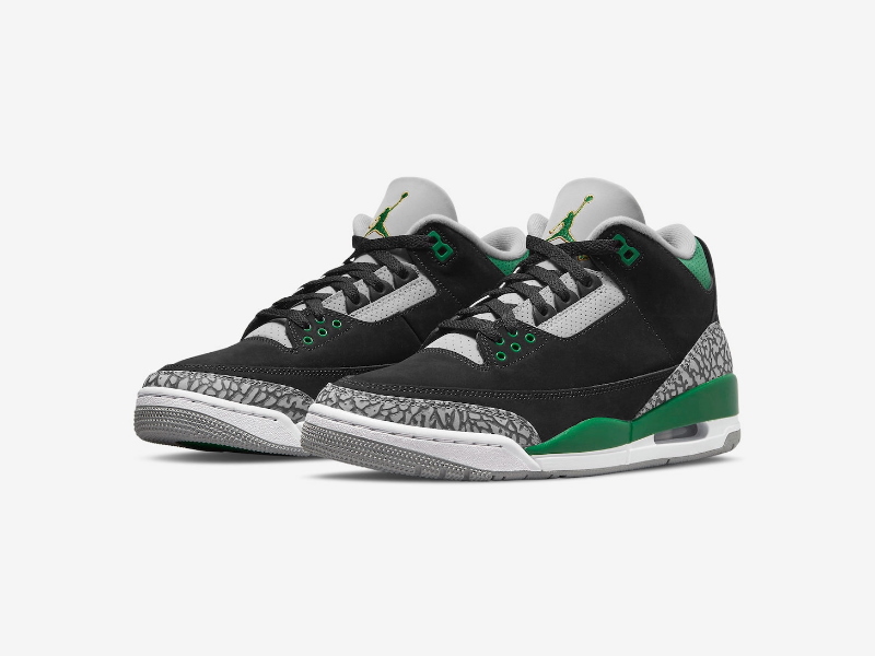 Jordan 3 Retro Pine Green имеют верх из черного нубука с акцентами цвета сосны на мидсоли, щиколотке, логотипе и люверсах. Фирменный принт в виде слона на мыске и пятке поверх белой межподошвы, а серая резиновая подошва завершает дизайн.- Цвета: Black/Pine Green/Cement Grey-White