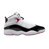 Модель Jordan 6 Rings "Chicago Bulls" сочетает в себе элементы каждого из шести чемпионских силуэтов Майкла Джордана. Верх из белой баллистической сетки дополнен накладкой из искусственной кожи в тон и брызговиком из черной лакированной кожи. Контрастные акценты Varsity Red расставлены на литых люверсах из TPU, синельной нашивке Jumpman на язычке и спойлере. Легкая амортизация обеспечивается за счет скульптурной подошвы из пеноматериала с амортизацией Zoom Air в носочной и пяточной частях.