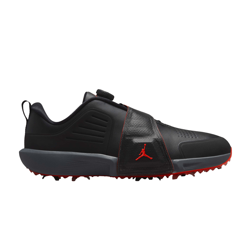 Jordan Air Rev 'Bred' - это обтекаемые кроссовки для гольфа с черным верхом из водонепроницаемой искусственной кожи, закрепленным системой шнуровки и ремешком для индивидуальной посадки. Инновационная технология Flight Lock в Air Rev представляет собой подвижный блок Air Zoom, который вставляется в чехол вдоль боковой поверхности стопы гольфиста, чтобы обеспечить необходимое давление при каждом взмахе. В основной части стопы используется вставка из пеноматериала Formula23 для обеспечения стабильности.