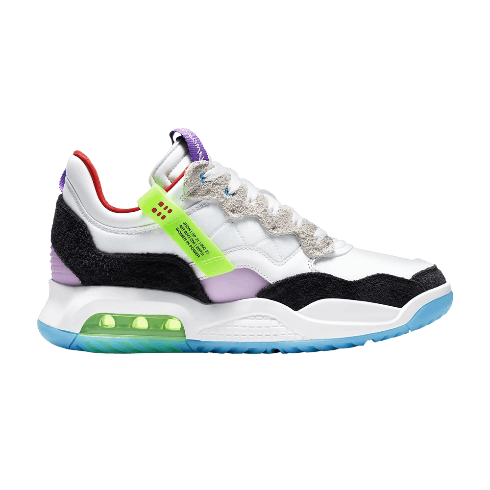 Jordan MA2 'Greatest Gift' - это неоновые вспышки цвета на силуэте, сочетающем динамичные линии, уникальные элементы брендинга и мягкую амортизацию. Верхняя часть выполнена из белого текстиля с контрастными черными замшевыми накладками на носке и пятке. Светло-фиолетовый оттенок отличает формованную панель пятки и тесьму на язычке с надписью "Women in Power" на левой и правой стороне кроссовка. Пенопластовая подошва позаимствована у Jordan Max 200 и дополнена зеленым блоком Max Air в пятке.