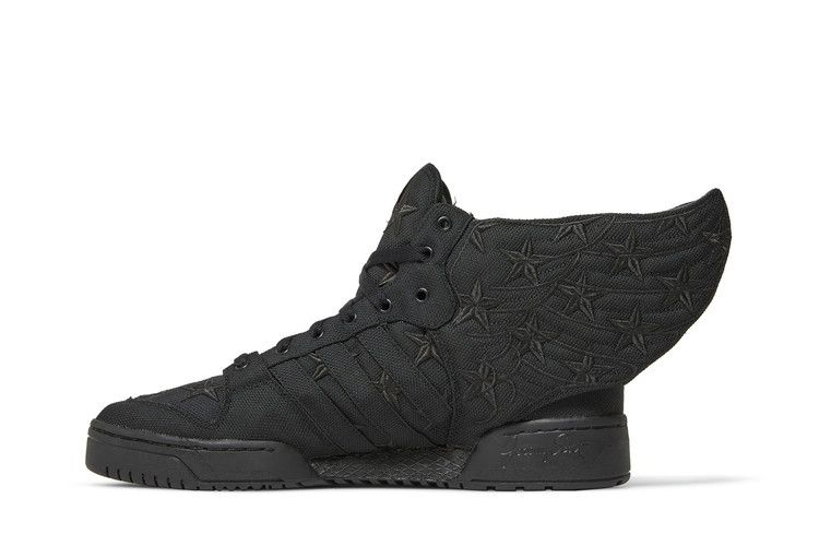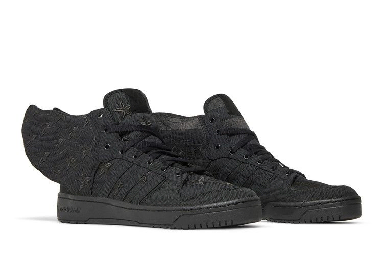 Эта коллаборация 2013 года между дизайнером одежды высокого класса Джереми Скоттом и гарлемским хип-хоп исполнителем A$AP Rocky имеет расцветку, основанную на черно-белом мотиве американского флага с обложки его альбома Long. Live. A$AP. Верх кроссовок выполнен из черного холста с фирменными крыльями Джереми Скотта на пятке. Кроме того, на правом ботинке вышиты звезды, на левом - полосы, а подошва полностью черная.- Модель: Кроссовки adidas Jeremy Scott Wings