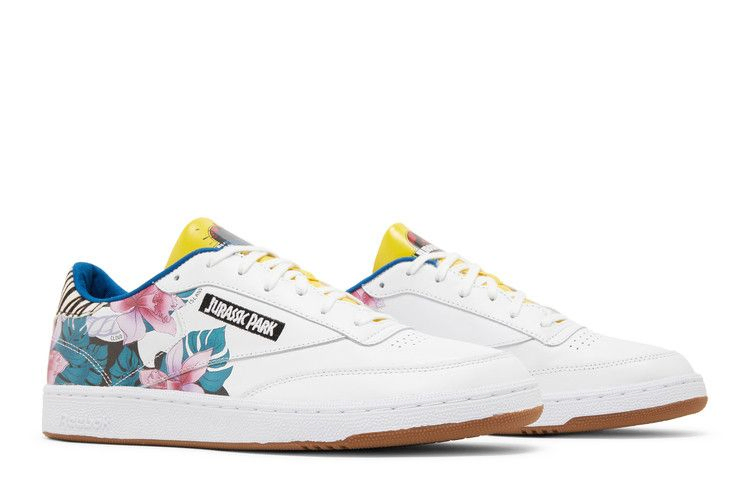 Модель Jurassic Park x Reebok Club C 85 "Dennis Nedry", выпущенная в рамках обширной коллекции, посвященной приключенческому фильму 1993 года, украшена цветочным принтом на белом верхе из лакированной кожи - кивок в сторону красочных гавайских рубашек, которые предпочитал злодейский программист Уэйн Найт. Полоски зебры на пятке из конского волоса отсылают к заставке персонажа. Брендинг Jurassic Park украшает задник и язычок кроссовок, а прорезиненная ярко-желтая отделка соответствует дождевику, который Деннис надевает на свою безвременную кончину.