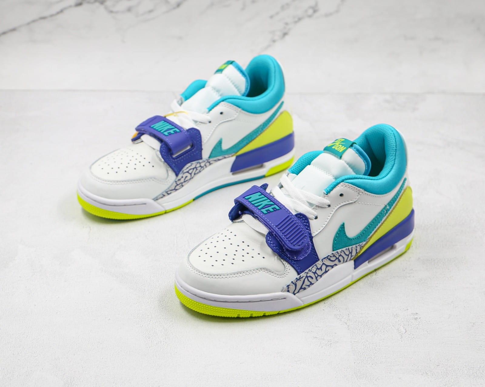 В сотрудничестве с брендом спортивной одежды класса люкс Just Don, смелое выражение стиля Air Jordan Legacy 312 Low возрождает коды наследия. Это издание "Neon Aquamarine", выпущенное в июне 2019 года, имеет кожаный верх с фирменным ремешком, замшевыми Swooshes и панелями со слоновьим принтом. Неоновый оттенок украшает стойку, специальный язычок и логотип на пятке. Резиновая подошва, поддерживаемая видимым блоком Air в промежуточной подошве, выполнена в яркой двухцветной гамме.- Цвета: White/Ultramarine-Neon Yellow-Aquamarine