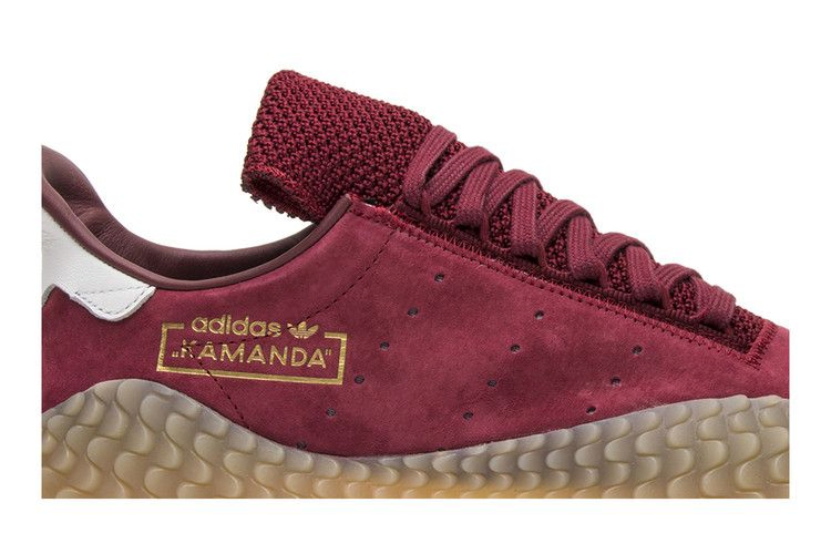 Силуэт Kamanda от adidas сочетает в себе элементы футбольного наследия бренда и дизайн, вдохновленный моделью Samba. Верх кроссовок выполнен из замши бордового цвета, а пятка украшена золотым брендингом, а подошва - текстурированной резиной. Яркая расцветка силуэта контрастирует с белой панелью на пятке.