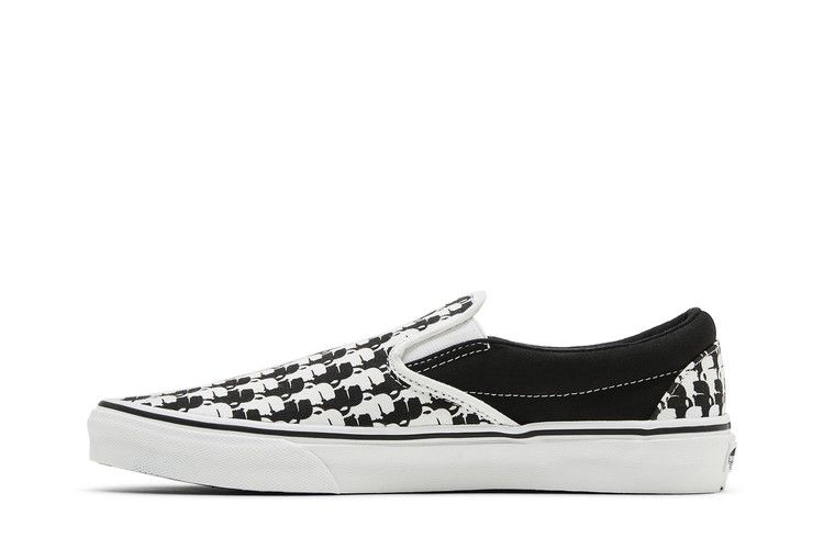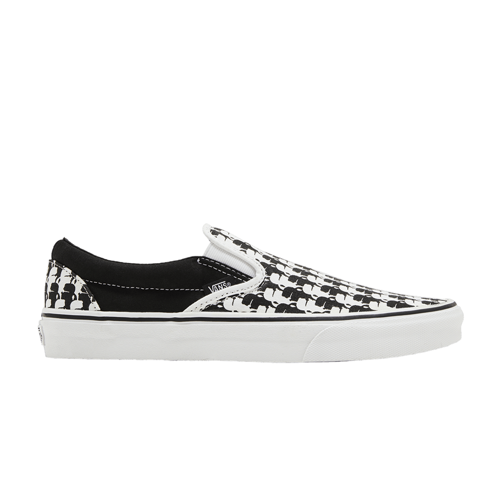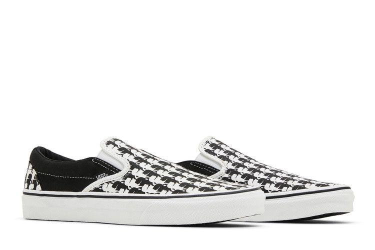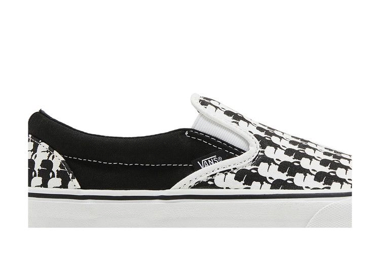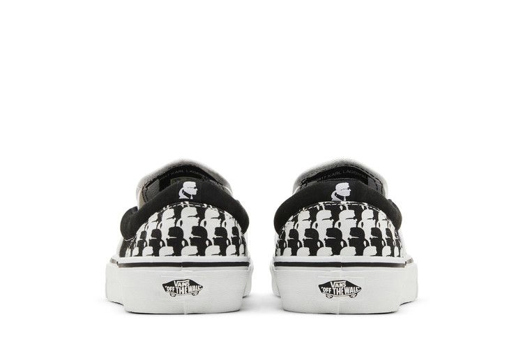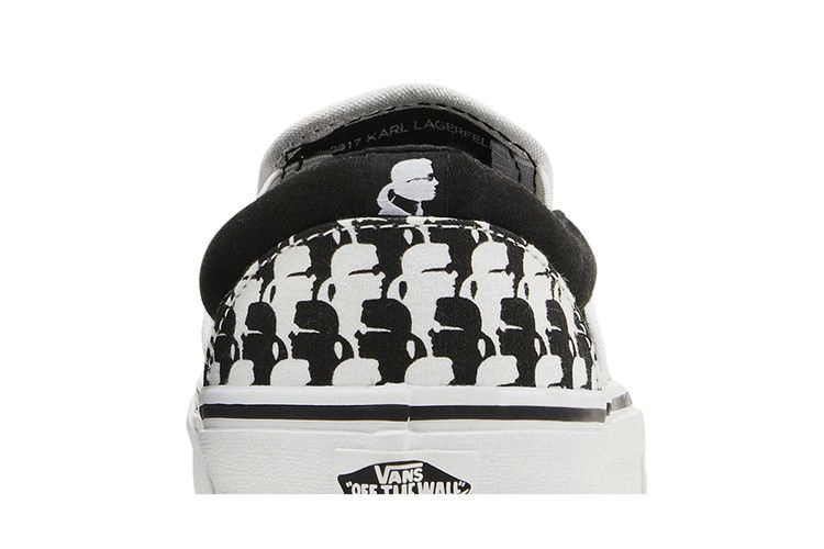 Vans сотрудничает с Карлом Лагерфельдом, чтобы создать высокомодную версию силуэта Classic Slip-On. Ботинки выполнены в монохроматическом цвете, отражающем дизайнерский подход модного дома. Верхняя часть из канваса украшена повторяющимися карикатурами Карла Лагерфельда, воссоздающими знаковый для калифорнийского скейт-бренда узор в виде шашечек.