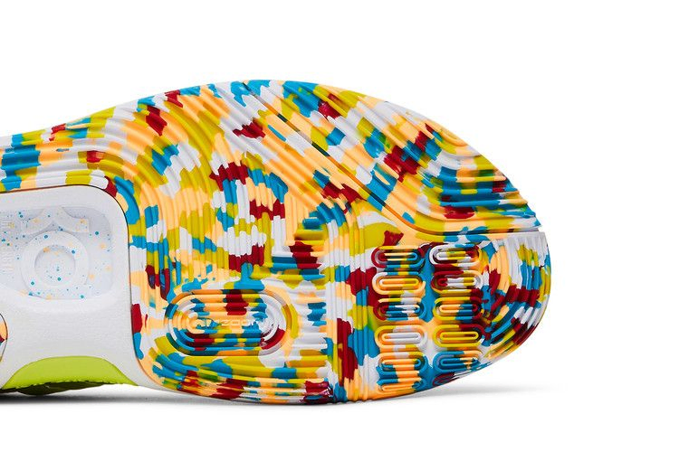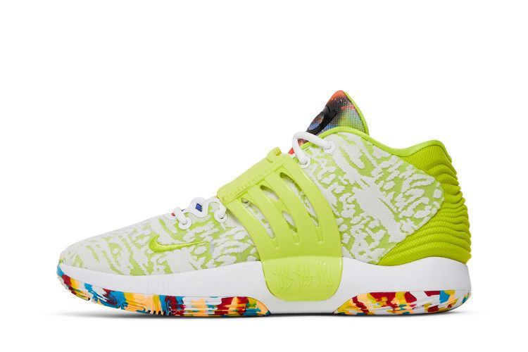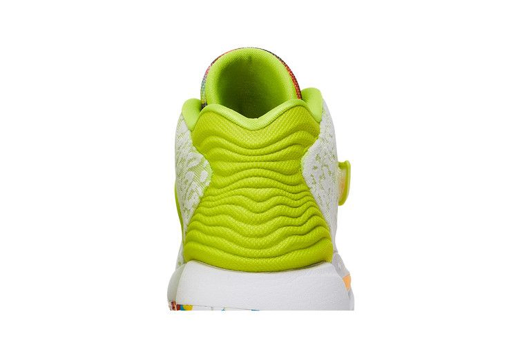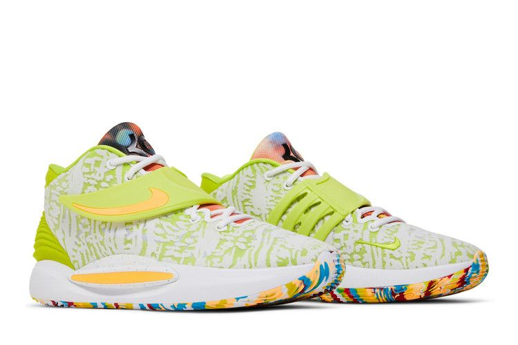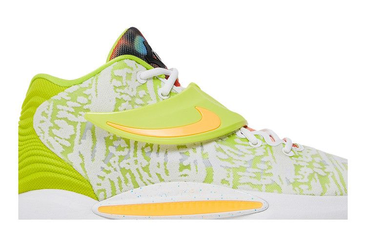 Nike KD 14 EP 'Cyber', выпущенные эксклюзивно в Большом Китае, представляют собой одну из дебютных расцветок 14-й фирменной модели Кевина Дюранта. Верхняя часть кроссовок изготовлена из сетки цвета лайма с белыми текстильными накладками, на которые нанесен замысловатый принт по всей поверхности. Тот же зеленый оттенок повторяется на регулируемом ремешке в средней части стопы, который напоминает Nike Presto, если смотреть с медиальной стороны. Легкая амортизация обеспечивается благодаря промежуточной подошве Cushlon и полноразмерной подметке Zoom Air Strobel. Версия EP имеет сверхпрочную многоцветную резиновую подошву, предназначенную для игры на открытых площадках.