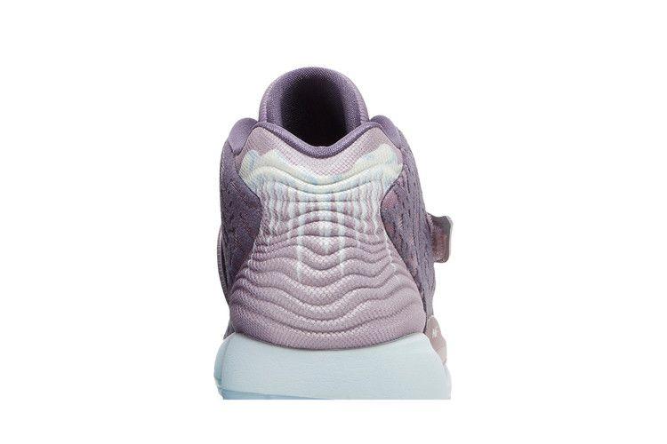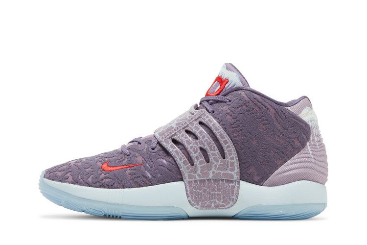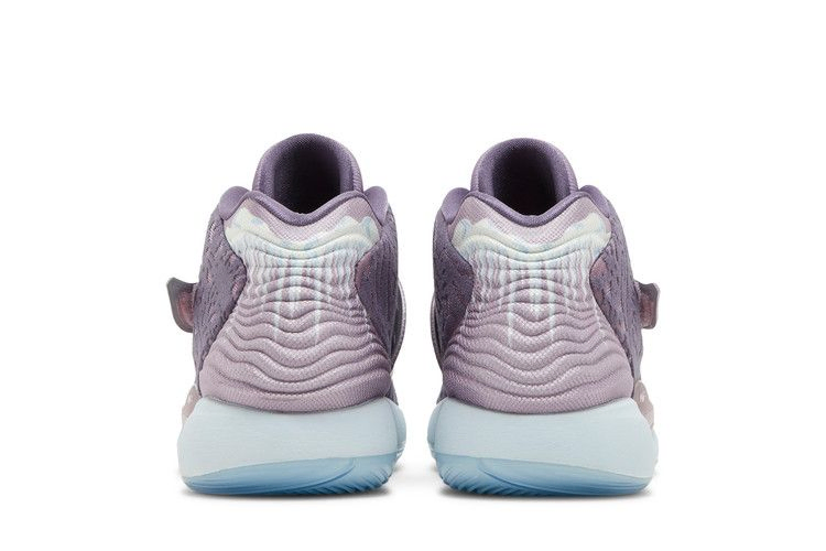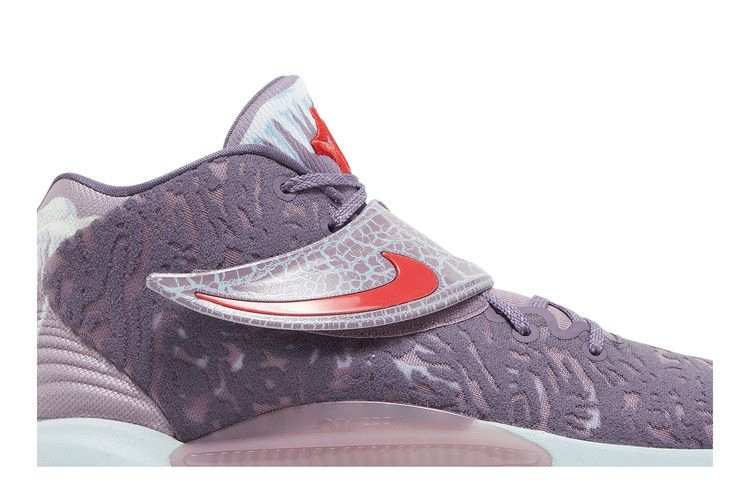 Кроссовки Nike KD 14 NRG "Valentine's Day" посвящены романтическому празднику с пастельными оттенками и уникальными деталями. Нежно-сиреневая отделка нанесена на узорчатый верх из сетки и текстиля, закрепленный светоотражающими шнурками и формованным ремешком в средней части стопы. Логотип Кевина Дюранта "KD" вышит на правом язычке, а на носках красуются несовпадающие изображения сердца и купидона. Кроссовки опираются на легкую промежуточную подошву Cushion, дополненную полноразмерными Air Zoom Strobel, пришитыми прямо к верху. Подошва из полупрозрачной резины обеспечивает надежное сцепление с поверхностью.- Артикул: DJ4336-900