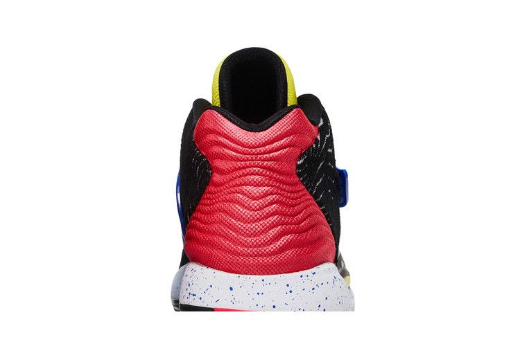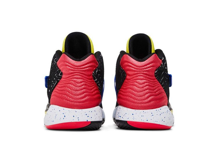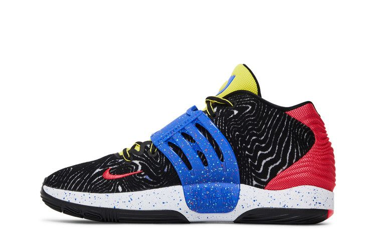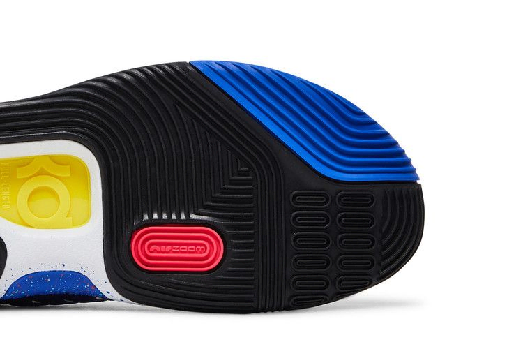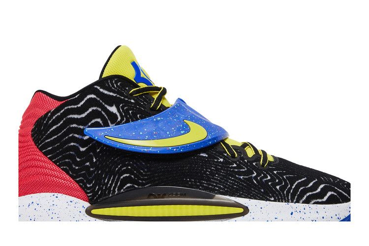 Nike KD 14 "Pop Art" выделяет акценты основного цвета на четырнадцатых фирменных кроссовках Кевина Дюранта. Завихряющиеся черные линии выделяют многослойный сетчатый верх, закрепленный традиционными шнурками и формованным ремешком в средней части стопы королевского синего цвета. Ярко-красная отделка нанесена на скульптурную панель пятки, а язычок с логотипом KD выполнен в цвете Yellow Strike. Легкая амортизация обеспечивается полноразмерным Air Zoom Strobel и пятнистой подошвой из пеноматериала Cushlon, оснащенной жестким элементом TPU на боковой стенке для повышения устойчивости. Прочная резиновая подошва обеспечивает надежное сцепление с поверхностью во всех направлениях.