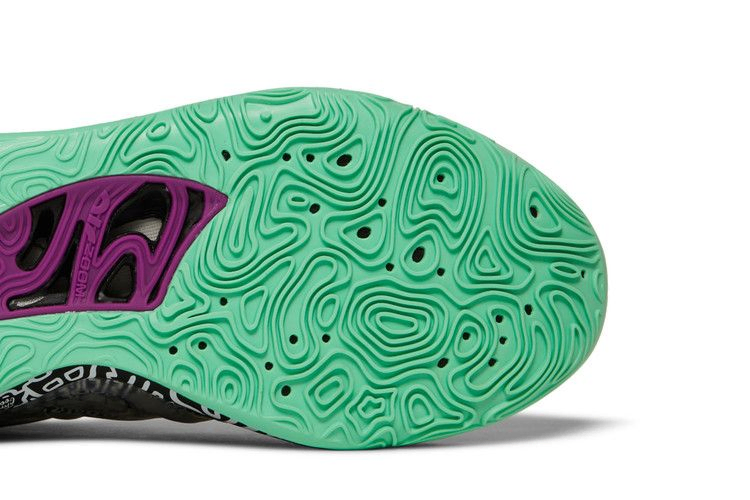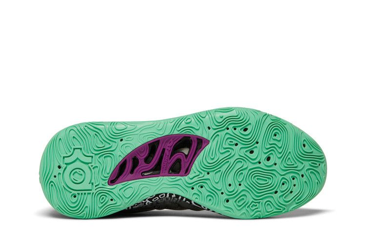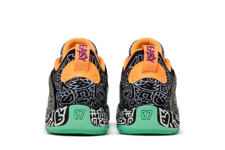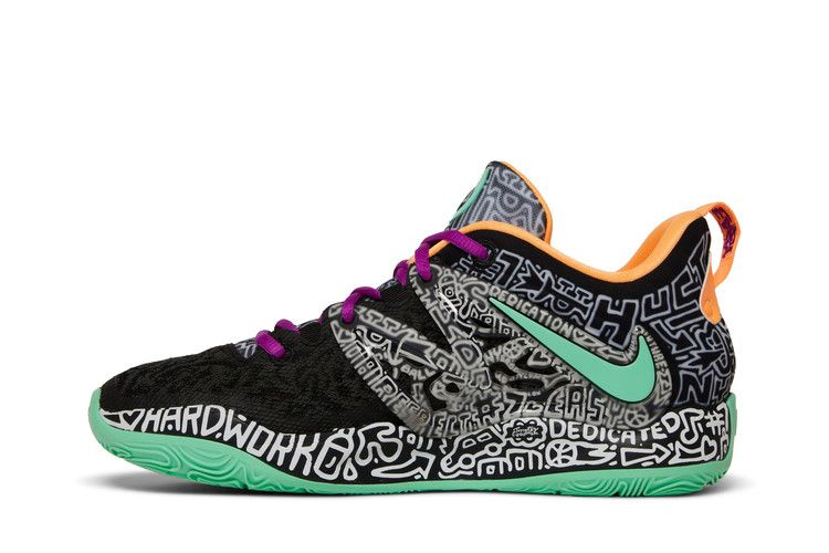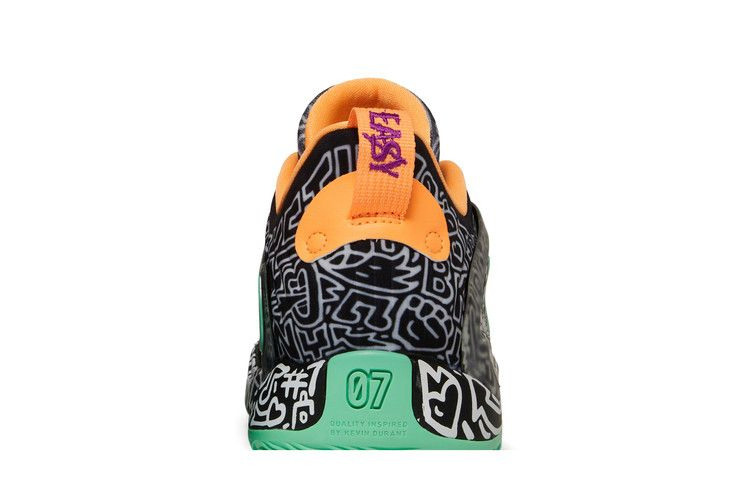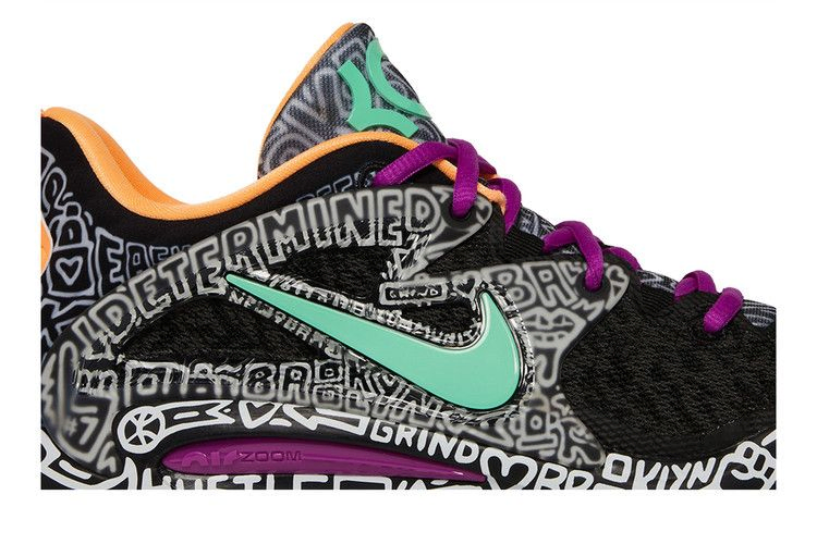 Timothy Goodman x Nike KD 15 'Brooklyn Courts' демонстрирует броский графический принт на легкой и непритязательной модели. Верхняя часть из черного трикотажного текстиля укреплена накладками с граффити-принтом, на которых изображены такие выразительные слова, как "Hustle", "Dedicated" и "Grind". Фиолетовые шнурки проходят через полупрозрачные крылья из TPU, обеспечивая надежную фиксацию, а ярко-оранжевый язычок на пятке облегчает надевание и снятие. Низкие кроссовки опираются на полноразмерную промежуточную подошву Cushlon, дополненную видимым блоком Air Zoom Strobel и поддерживаемую резиновой подошвой, вдохновленной топографической картой.- Артикул: DC1975-005