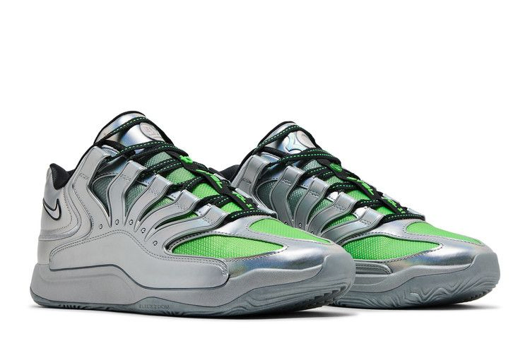 Модель Nike KD 18 "EYBL" посвящена Элитной молодежной баскетбольной лиге Nike, в которой выступают лучшие спортсмены США школьного возраста. Неоново-зеленые шнурки фиксируют верхнюю часть кроссовок, а на носочной части имеется сетка, подобранная по цвету. Верхняя отделка из синтетической кожи выполнена в серебристом металлическом цвете, в том числе клетка в средней части стопы, вдохновленная моделью Air Terra Humara. Радужные акценты мерцают на логотипе Swoosh и логотипе KD на язычке. Легкая межподошва из пеноматериала с амортизацией Zoom Air в передней части стопы и блоком Air Strobel в пятке.