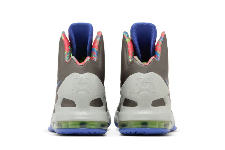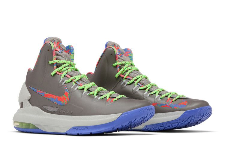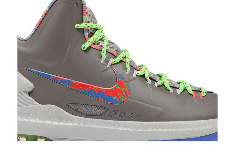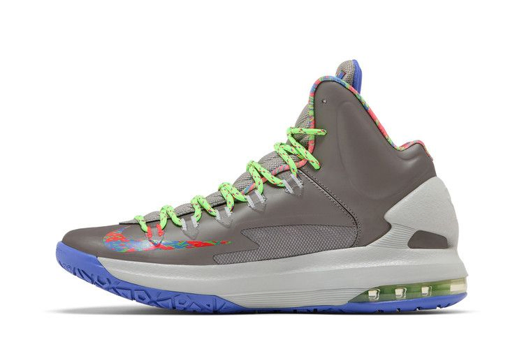Nike KD 5 "Splatter" получили свое название благодаря многоцветному рисунку на фирменном свуше и подкладке воротника, который выделяется на фоне нейтрального серого оттенка, покрывающего цельный верх из материала Hyperfuse. Дополнительный всплеск цвета придают веревочные шнурки и видимый блок Air Sole в пятке, выполненные в электрическом зеленом цвете, а также резиновая подошва цвета Violet Force.