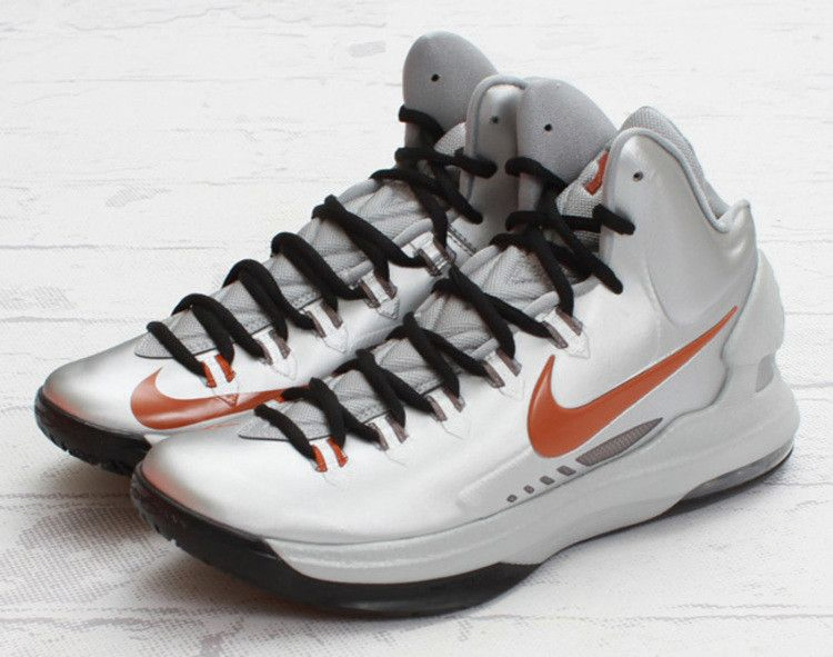 Пятые фирменные кроссовки Кевина Дюранта от Nike представлены в дизайне с высоким верхом, который отдает дань уважения игровым дням Дюранта в Техасском университете. Верх кроссовок выполнен из гладкой серебристой кожи цвета металлик и контрастирует с оранжевым цветом пустыни на логотипе Swoosh и KD. В промежуточной подошве сочетаются технологии Nike Air и Nike Zoom, что обеспечивает гибридную платформу, а подошва выполнена в черном цвете.