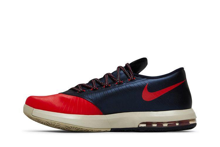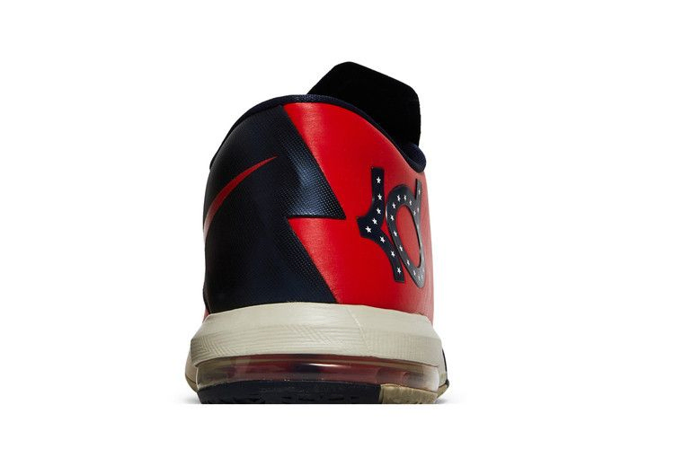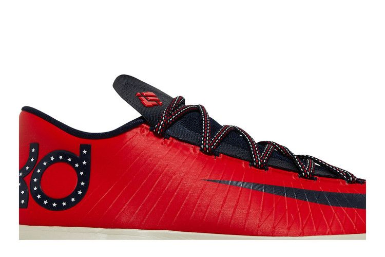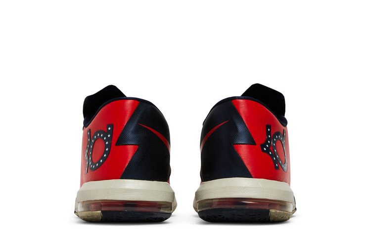 Модель KD 6 "DC" выполнена в красно-бело-синей цветовой гамме, вдохновленной временами Кевина Дюранта, когда он играл в баскетбол в округе Колумбия, Мэриленде и Вирджинии. Патриотический дизайн создан из бесшовного двухслойного верха с тросами Flywire, которые усиливают устойчивость в средней части стопы, а под подошвой расположен многослойный шестиугольный рисунок.