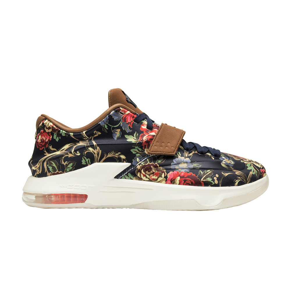 Nike KD 7 EXT Floral QS были быстро выпущены в феврале 2015 года. Модель в цветах Midnight Navy, черный и лесной орех имеет уникальную цветочную графику на верхней части, лесной ореховый ремешок и язычок, белую промежуточную подошву и льдисто-голубую полупрозрачную подошву.