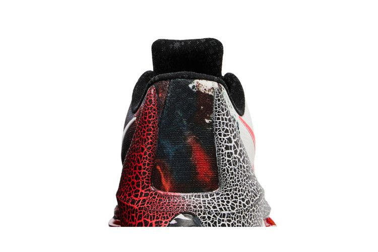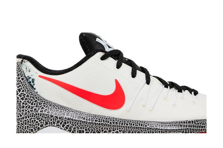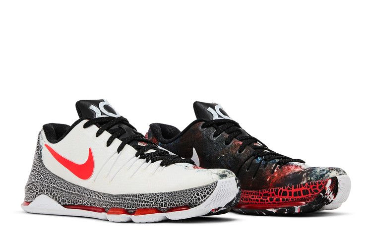 Восьмые фирменные кроссовки Кевина Дюранта имеют верх из плетения Flyweave и полноразмерный блок Zoom Air в межподошве. Рождественская" расцветка, дебютировавшая в 2015 году, представляет собой смелый двухцветный дизайн силуэта. Медиальная сторона кроссовка покрыта смесью красного, черного и синего цветов, в то время как латеральная сторона одета в чистый белый оттенок. На брызговике красуется принт в стиле сафари - одна сторона красная, другая черно-белая, а на подошве еще более заметен эффект разделенного бело-брызгового верха.