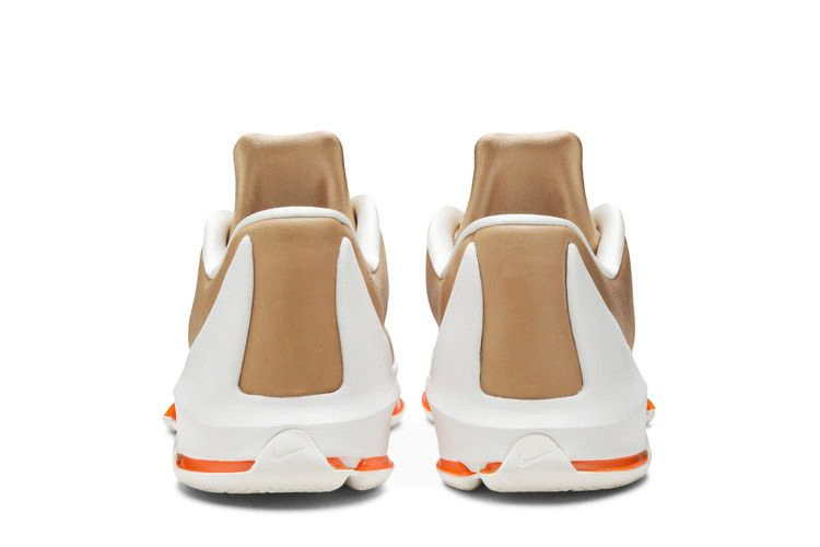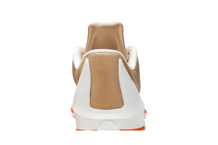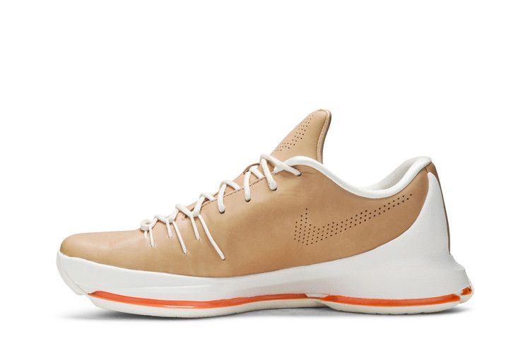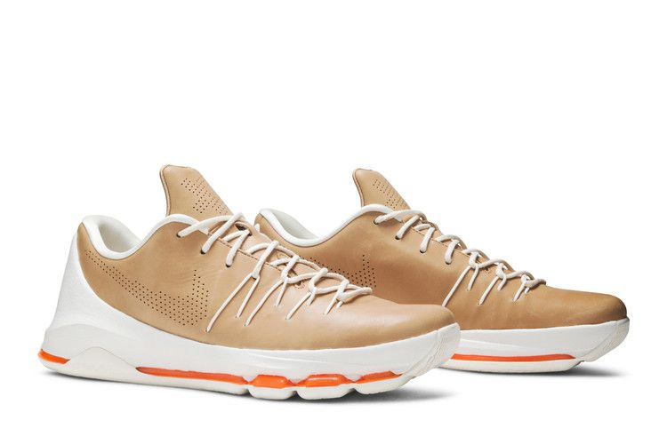 Эти низкие кроссовки KD 8 EXT отличаются кожей Vachetta Tan, из которой выполнен верх. На боковине расположен перфорированный логотип Swoosh, такая же концепция использована на язычке. Оранжевый цвет прослеживается на блоке Zoom Air, который размещен в белой промежуточной подошве. Шнурки Flywire дополнены золотыми наконечниками.