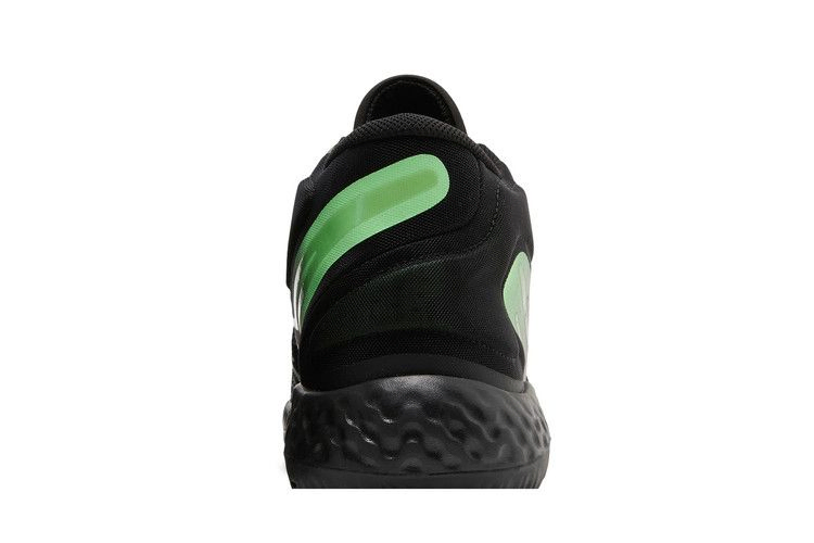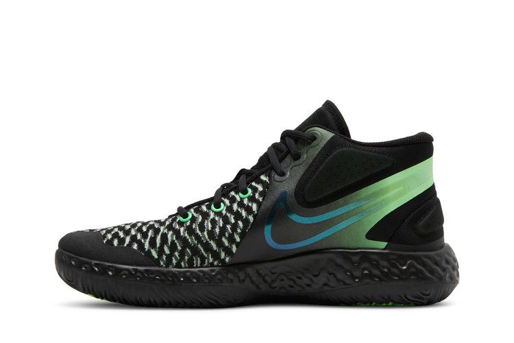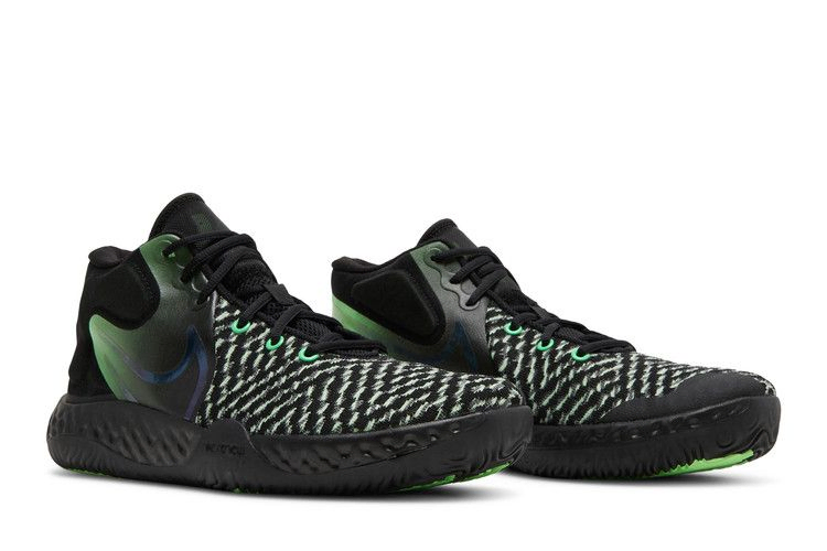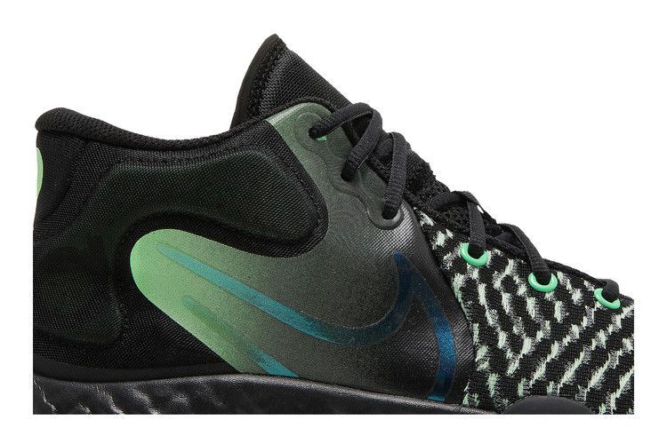 Nike KD Trey 5 VIII "Black Illusion Green" - это фирменные средние кроссовки Кевина Дюранта с привлекательным внешним видом, подчеркнутым радужным контуром Swoosh и градиентной зеленой окраской накладки на пятке. Передняя часть стопы обтянута двухслойным трикотажем с прозрачными нитями, вплетенными в абстрактный дизайн для придания ему динамичности. Кроссовки опираются на промежуточную подошву из вспененного материала с ямочками, подкрепленную резиновой подошвой с личным логотипом KD.