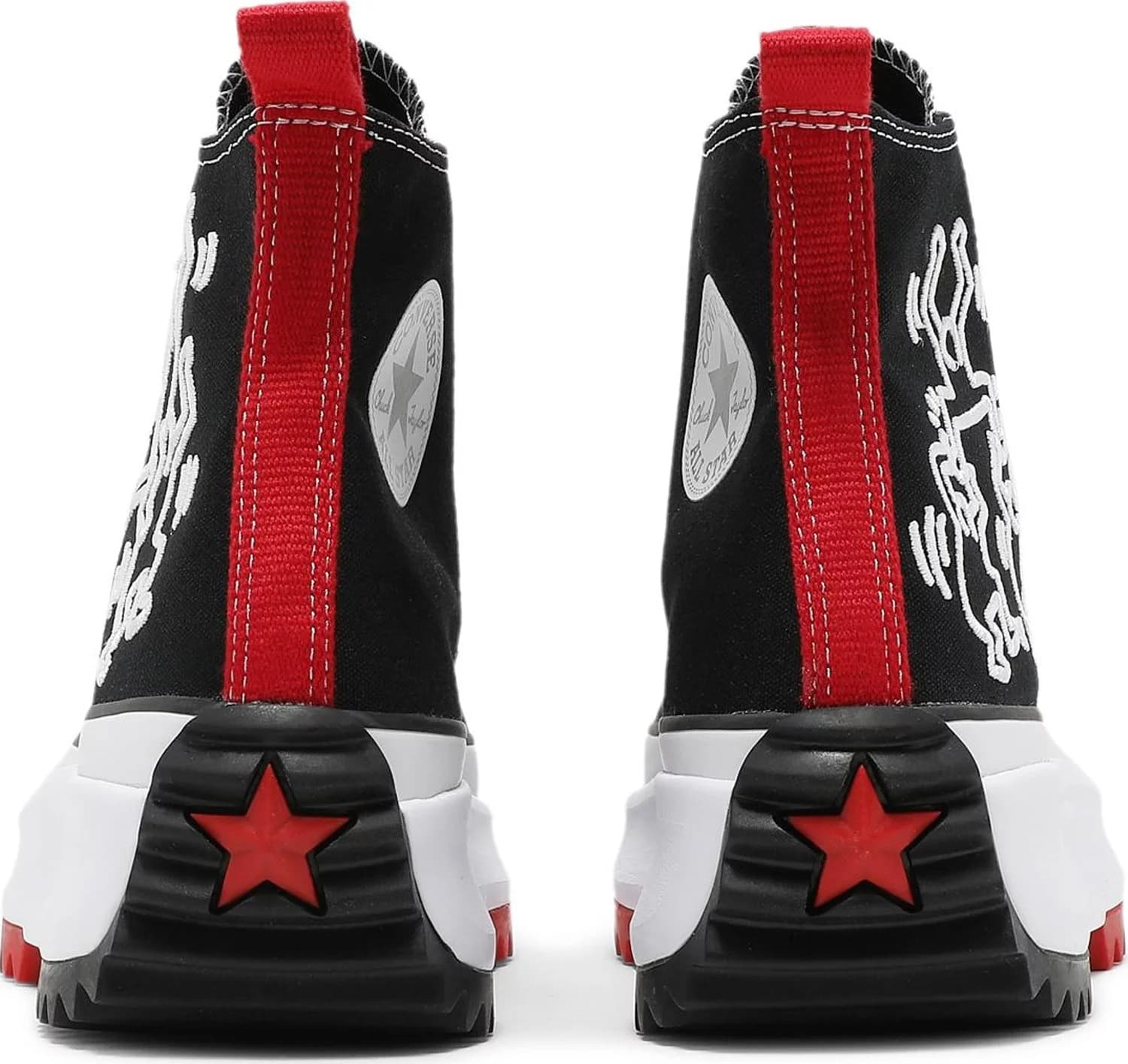 Модель Keith Haring x Converse Run Star Hike, выпущенная в рамках капсульной коллекции, посвященной новаторскому поп-художнику 80-х годов, выполнена из черного канваса с контрастной строчкой и малиновой тесьмой. На медиальной лодыжке красуется нашивка All Star, а на противоположной стороне - вышитая графика, изображающая рисунки художника, похожие на граффити. Подпись Харинга нанесена на язычке и носочной части. Высокие кроссовки установлены на платформенную промежуточную подошву, которая поддерживается подметкой из резины sawtooth с цветовым блоком.- Цвета: Black/White/Red