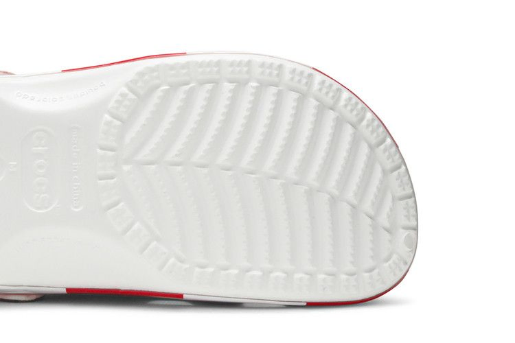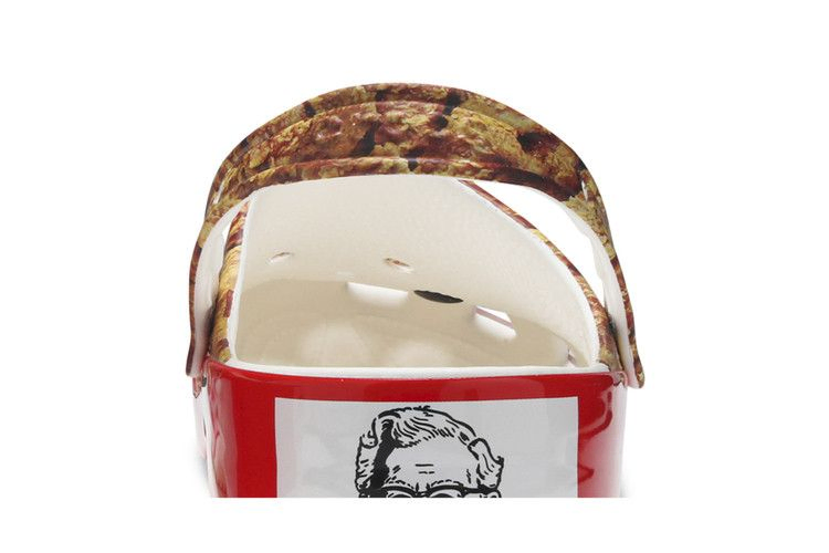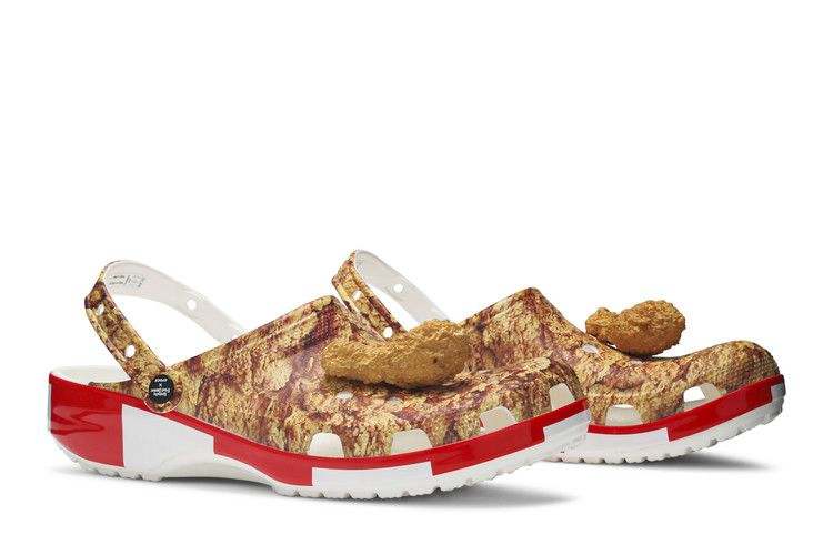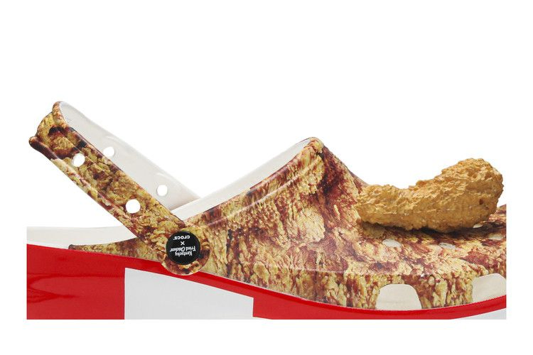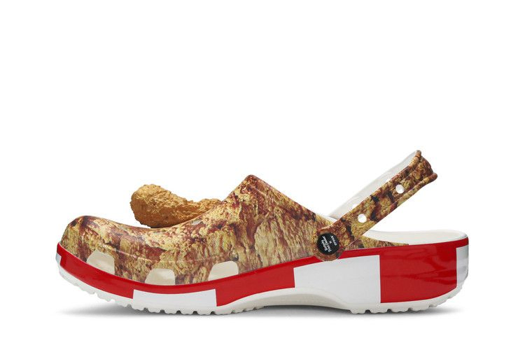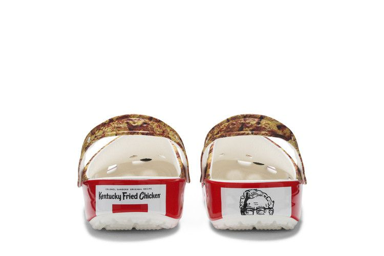 Модель KFC x Crocs Classic Clog 'Fried Chicken Print', созданная в сотрудничестве с сетью ресторанов быстрого питания, представляет собой игривый дизайн, посвященный оригинальному рецепту полковника. Перфорированный верх покрыт принтом в виде жареного цыпленка, а в комплекте с сабо идут два брелока Jibbitz, напоминающие и пахнущие настоящими барабанными палочками. Подошва выполнена в виде красно-белых полос, которые украшают ведро KFC, а на правой пятке красуется изображение полковника Сандерса.