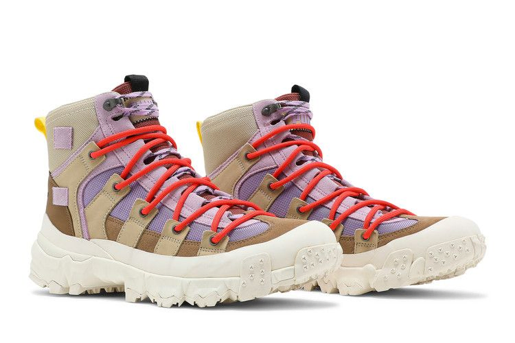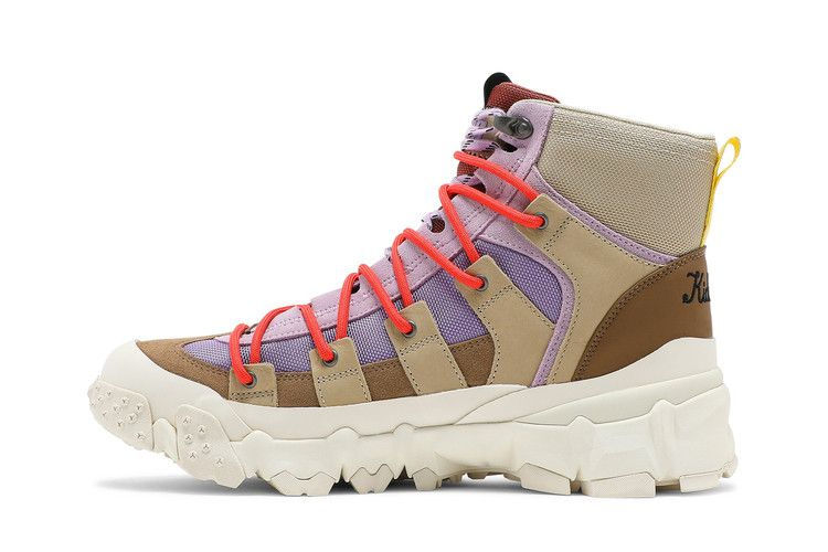 Модель KidSuper Studios x PUMA Trailfox Boots 'Lupine Paloma' представляет собой игривую, экспериментальную интерпретацию прочного силуэта для активного отдыха. Творческий коллектив из Бруклина одел гибрид кроссовок и ботинок в лавандовую нейлоновую сетку с контрастными бежевыми замшевыми накладками. Плоские шнурки в стиле ghillie дополнены дополнительным набором веревочных шнурков ярко-малинового оттенка, продетых через металлические люверсы, расположенные в ряде ремешков из нубука цвета загара. Брендинг KidSuper красуется на кожаной накладке на пятке и индивидуальном носочке. Подошва из резины с высоким коэффициентом сцепления с поверхностью обеспечивает уверенное передвижение по неровной местности.