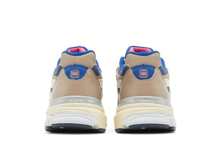 Модель Kith x New Balance 990v3 Made In USA 'Daytona' взята из юбилейного пакета из четырех частей, посвященного 10-летию Kith и 40-летию силуэта 990. Вдохновленные моделью Ронни Фига 'Daytona' 1600 2013 года, эти кроссовки имеют многослойный верх, выполненный в стиле колор-блок, с синей замшей на носке, белой замшевой панелью на четверти и серой кожаной накладкой на пятке. Яркие розовые акценты присутствуют на фирменном логотипе "N" и металлическом значке "KXTH", прикрепленном к пятке. Кроссовки опираются на двухцветную промежуточную подошву ENCAP, состоящую из мягкой пены и прочного полиуретанового обода.