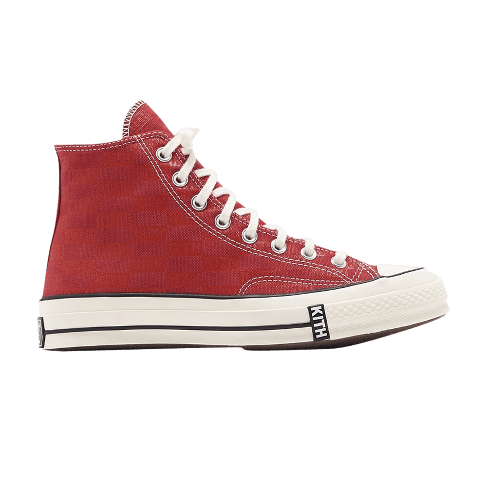 Модель KITH x Converse Chuck 70 'Salsa', выпущенная в рамках трехстороннего сотрудничества с нью-йоркским ритейлером, украшена тональным принтом монограммы KITH на красном холщовом верхе. Детали включают контрастную белую строчку, хромированные люверсы и круглую нашивку All Star на медиальной лодыжке. Модель стоит на резиновой подошве Off-White и украшена брендингом Kith на боковой стенке и классическим номерным знаком Chuck Taylor на пятке.
