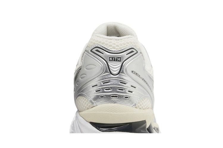 Модель 2024 года Kith x ASICS Gel Kayano 14 "Cream Scarab" имеет воздухопроницаемый сетчатый верх белого цвета, дополненный накладками из искусственной кожи цвета серебристого металлика. Темно-зеленые акценты расположены на носочной части, пятке и фирменных боковых полосах. Легкая промежуточная подошва из ЭВА обеспечивает видимую амортизацию Gel для усиления защиты от ударов. Подошва из прочной резины с полупрозрачным голенищем из TPU, получившая название системы поддержки TRUSSTIC.