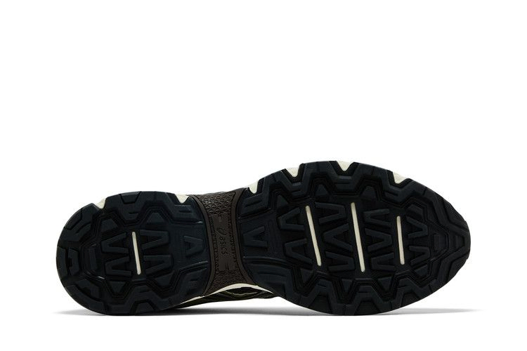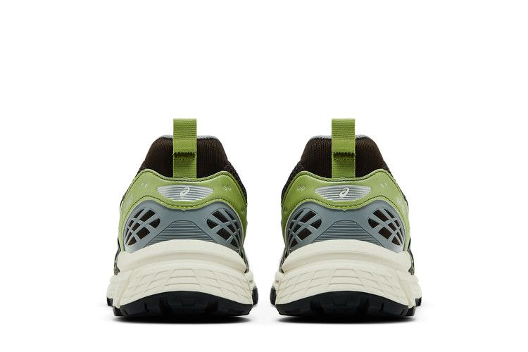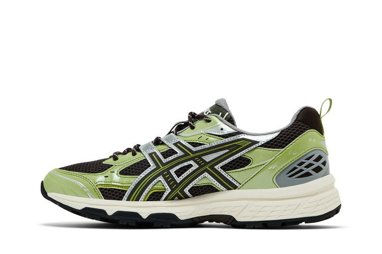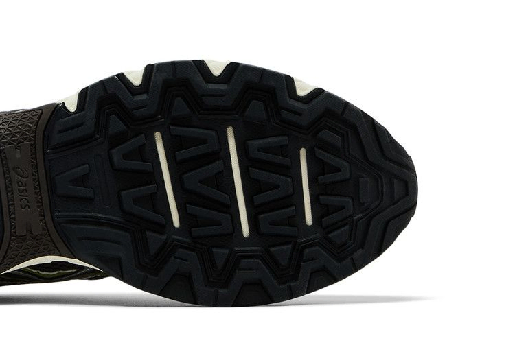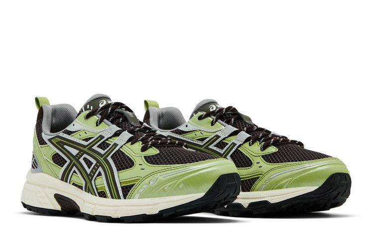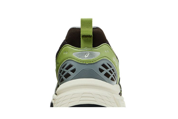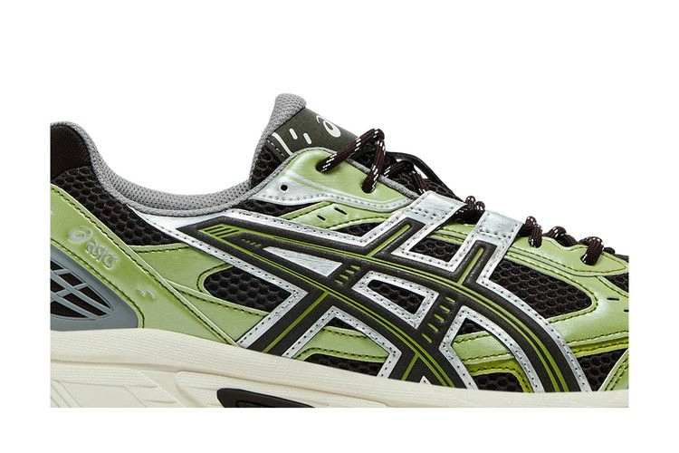 Кроссовки Kith x ASICS Gel Nunobiki 'Delicioso Pure Silver' выполнены из темно-коричневой сетки с открытыми ячейками и накладками из искусственной кожи фисташково-зеленого оттенка. Те же контрастные оттенки присутствуют на фирменных тигровых полосах, очерченных блестящей серебристой металлической отделкой. Двойной брендинг украшает клетчатый носок. Кроссовки дополнены белой промежуточной подошвой EVA с гелевой амортизацией в задней части стопы.