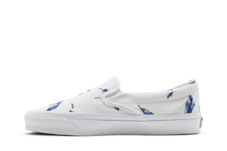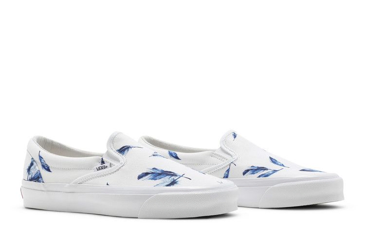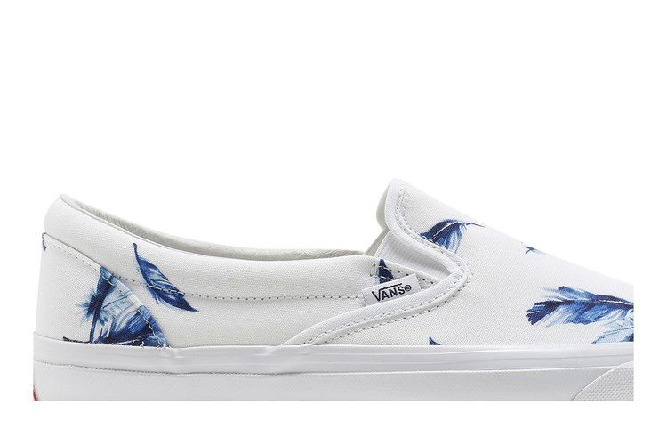 Модель Kith x Vans Vault OG Classic Slip-On LX 'Feathers', выпущенная в рамках большой коллекции, посвященной 10-летнему юбилею нью-йоркского ритейлера, имеет верхнюю часть из белой парусины, обшитую кожей и снабженную эластичными резинками для удобства надевания и снятия. Графический принт, состоящий из синих перьев, контрастирует с цветом. На носочной части стандартный брендинг Vans дополнен памятным логотипом "KXTH". Вафельная подошва из резины обеспечивает надежное сцепление с поверхностью.
