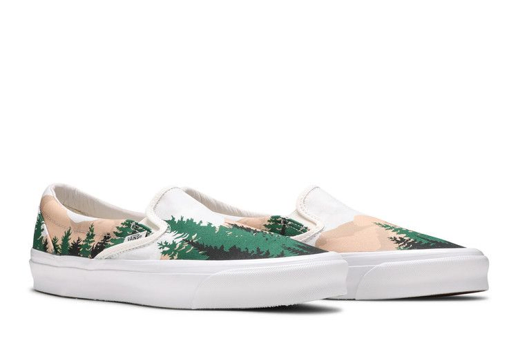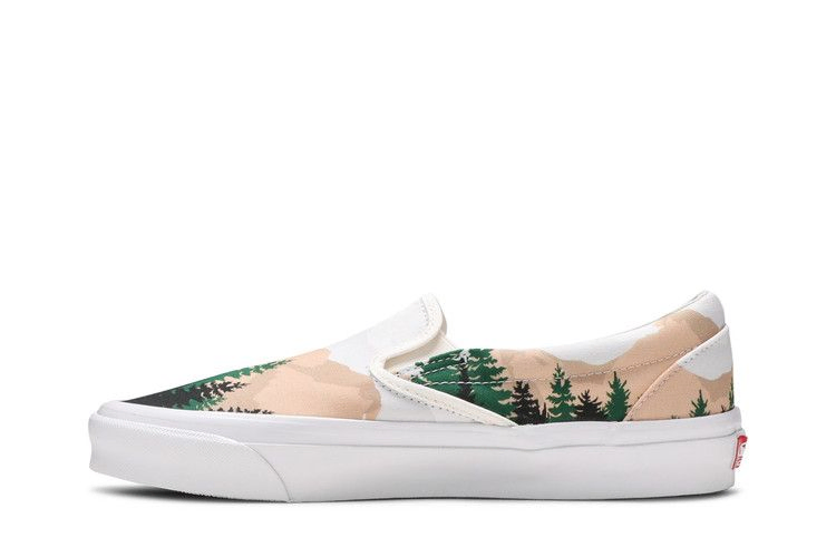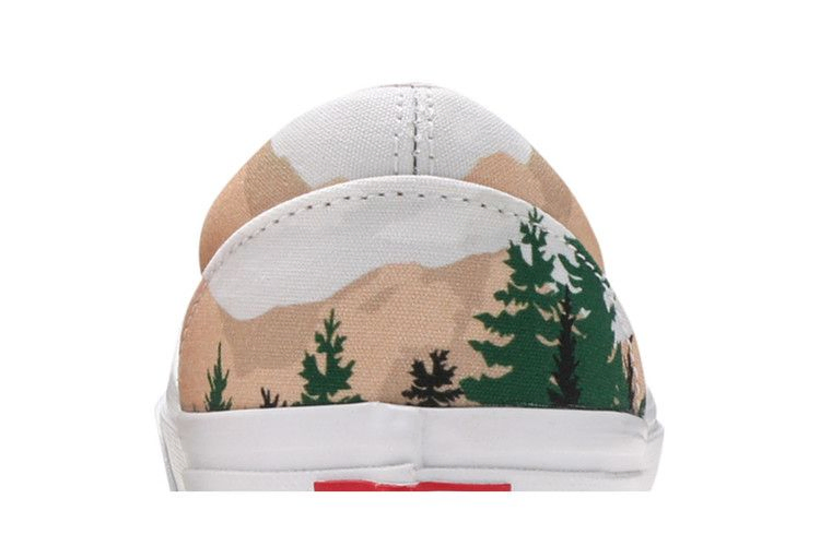 Модель Kith x Vans Vault OG Classic Slip-On LX 'Treescape', выпущенная в рамках большой юбилейной коллекции, посвященной десятилетию деятельности нью-йоркского ритейлера и бренда, использует стандартный холщовый верх и вулканизированную резиновую подошву. Первая украшена иллюстрацией, на которой на переднем плане изображен пышный лес, а на заднем - загорелые горные вершины. Под ногами - фирменная вафельная подошва Vans, выполненная из прочной резины.