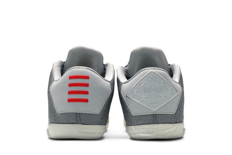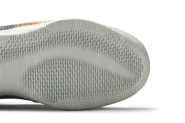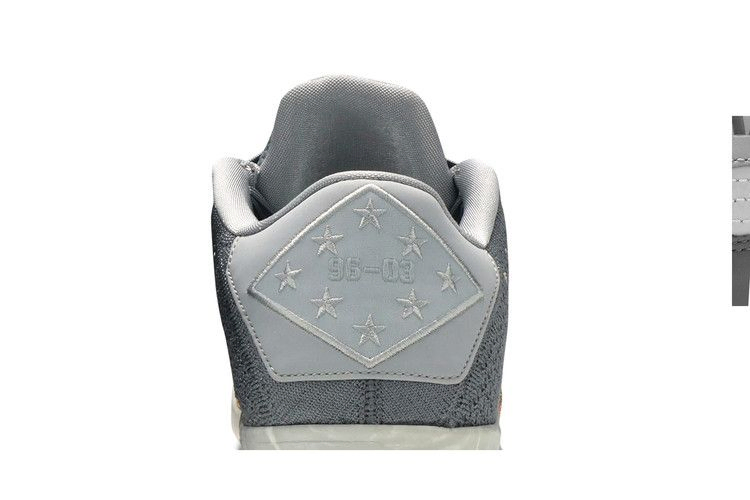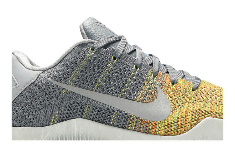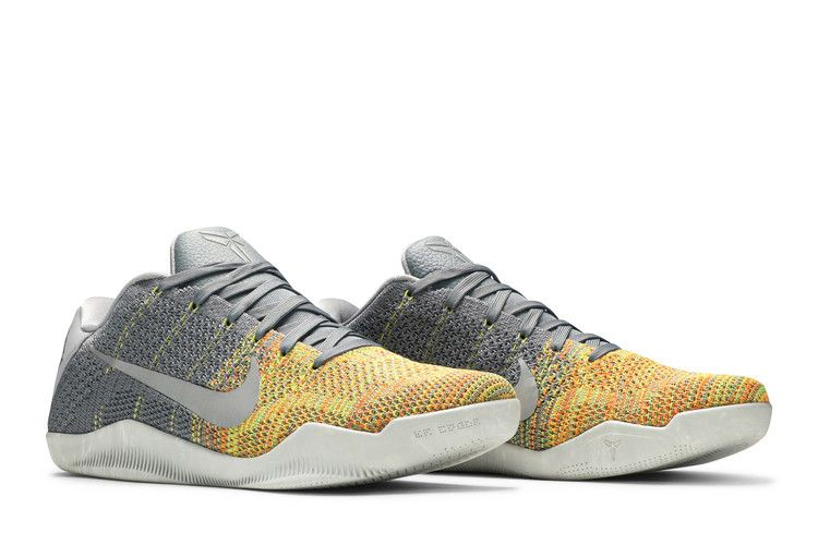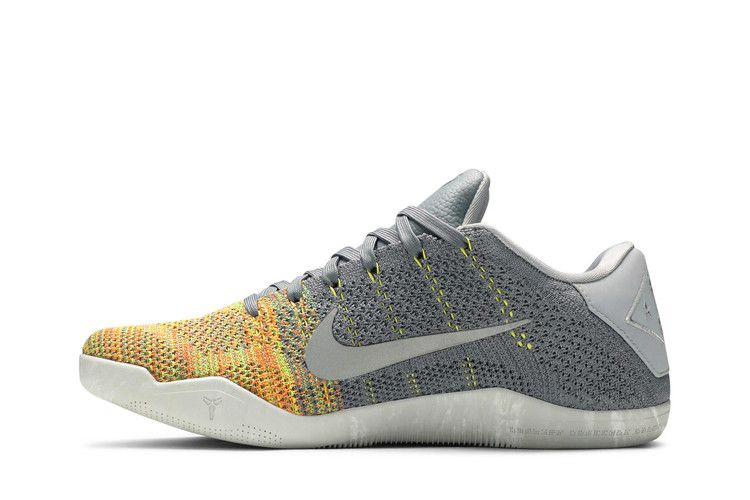 Модель Kobe 11 Elite Low "Master of Innovation" выполнена из флайкнита прохладного серого цвета, который переходит в желтый страйк и зеленый вольтаж на носке. На левой пятке красуется фирменный красный рисунок ахиллова сухожилия Коби, что свидетельствует о его возвращении в НБА после разрыва сухожилия, а на правой пятке - графическая надпись "96-03". Для более надежной фиксации на ноге предусмотрены тросики Flyknit на заднике.