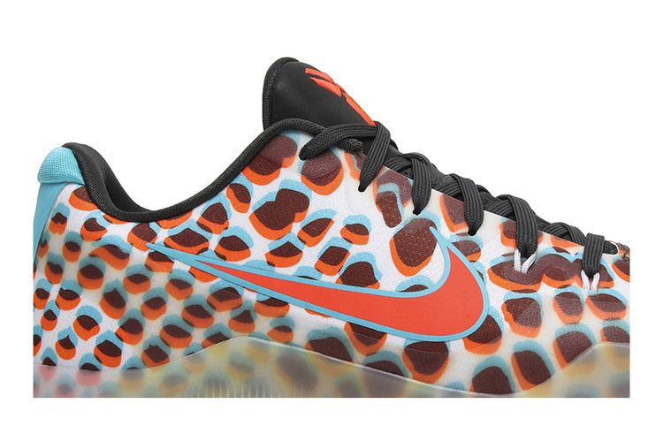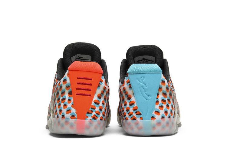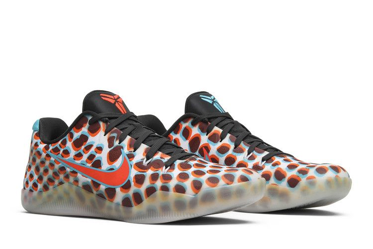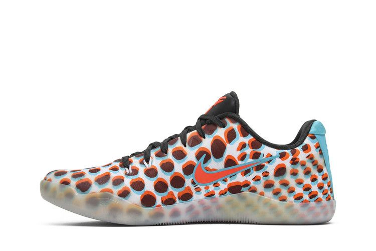 Игривая графика кроссовок Kobe 11 EM Low '3D' с принтом в горошек вдохновлена оптическими иллюзиями и 3D-объективами в кино. Выпущенные в июле 2016 года, они украшены пятнистым рисунком, который сочетает в себе малиновый и синий оттенки, создавая 3D-эффект на верхе из искусственной сетки. Чередующиеся красные и синие логотипы Swoosh на боковой части дополняют несовпадающие пятки, а ледяные полупрозрачные подошва и подошва завершают образ.