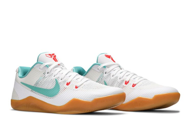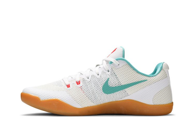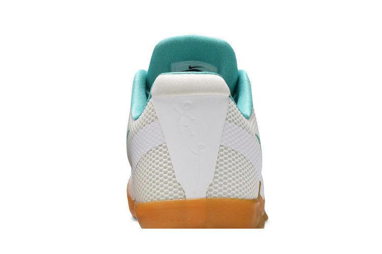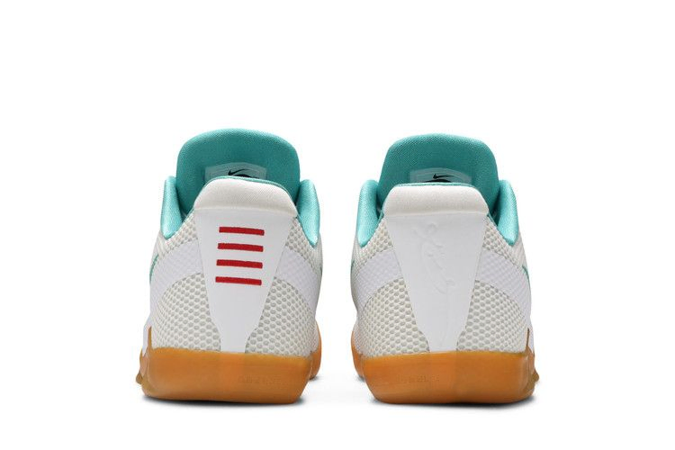 Модель Nike Kobe 11 EM Low "Summer" выполнена в расцветке, которая намекает на цвета страны, где вырос Коби Брайант, - Италии. На белом сетчатом верхе с зелеными вкраплениями - хотя и в акватоне, который отличается от традиционной итальянской версии, - изображены свуш и воротник, а на брендинге и петлях шнурков проглядывает оранжево-красный цвет. Снизу подошва выполнена из резины, которая облегает боковые стороны для дополнительной поддержки.