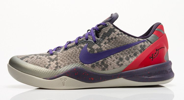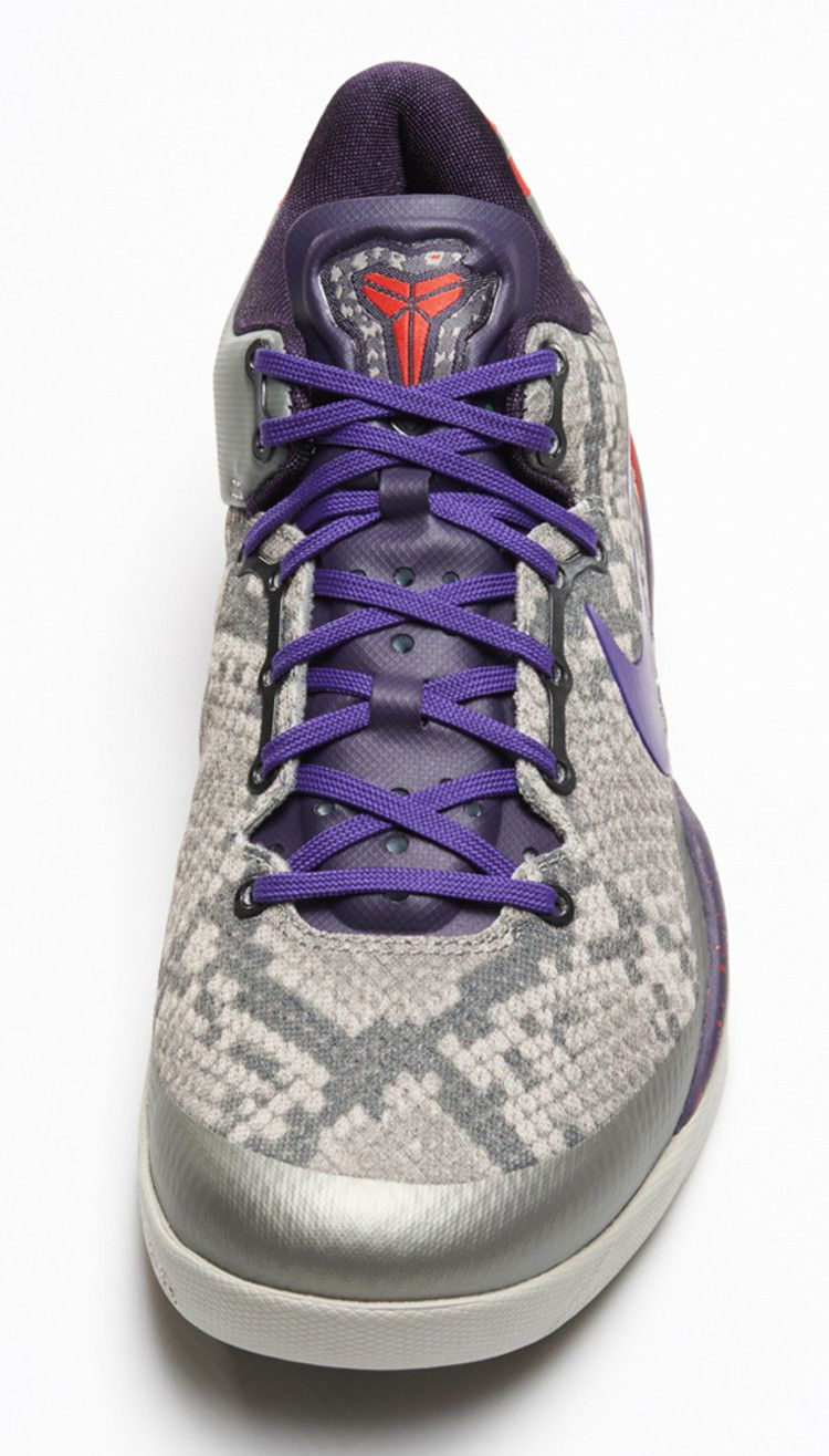 Kobe 8 "Mine Grey" украшены сетчатым верхом Engineered Mesh, что является первым случаем такого рода на баскетбольных кроссовках. Расцветка украшена графическим принтом в виде змеиной кожи, шнурки и брендинг выполнены в фиолетовом цвете, а на трехмерной стойке пятки - в красном. Полноразмерная промежуточная подошва Lunarlon обеспечивает мягкую посадку, а змеиный мотив также прослеживается в рисунке сцепления под ногами.