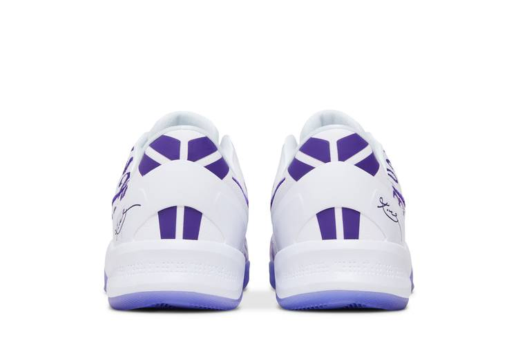 Nike Kobe 8 Protro "Court Purple" украшены принтом, состоящим из номеров джерси, которые Коби Брайант носил на протяжении своей 20-летней карьеры в команде Los Angeles Lakers. Цифры "8" и "24" расположены в виде повторяющегося узора на белом сетчатом верхе, закрепленном фиолетовыми шнурками и снабженном мягким воротником с низкой посадкой. Промежуточная подошва из пеноматериала React обеспечивает легкую амортизацию при каждом шаге. Под подошвой из полупрозрачной резины фиолетового оттенка видна пластина из углеродного волокна, обеспечивающая устойчивость стопы.