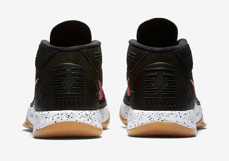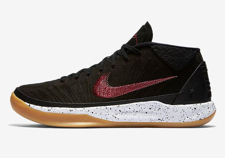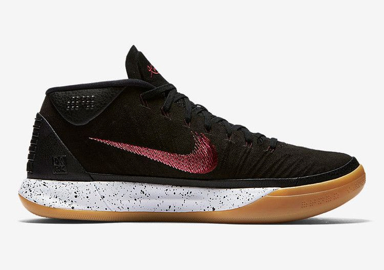 Модель Kobe A.D. Mid EP "Speckled Gum" получила свое название благодаря контрастным крапинкам на белой промежуточной подошве и резиновой подошве из жвачки. Верхняя часть модели выполнена из черной замши премиум-класса и украшена красными нитями Flywire, а также логотипами на язычке и тройным логотипом Swoosh.