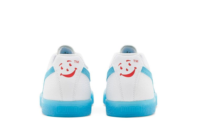 Kool-Aid x PUMA Clyde 'Blue Atoll' обновляет классический силуэт уникальными элементами брендинга, вдохновленными разноцветным напитком. Верх из белой кожи контрастирует с полосой Formstrip цвета воды, покрытой тисненым кракелюрным принтом - это намек на маркетинговую кампанию, в которой фигурировал человек Kool-Aid Man, пробивающийся сквозь кирпичную стену. Улыбающийся персонаж изображен на язычке, а двойной брендинг PUMA и Kool-Aid украшает малиновый язычок. Под ногами синяя полупрозрачная резиновая подошва с дополнительной графикой Kool-Aid Man.