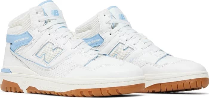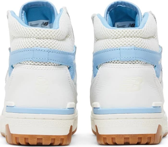 Модель Aimé Leon Dore x New Balance 650R 'White Blue Haze Gum', выпущенная в составе набора из трех предметов, представляет собой пастельную расцветку винтажных баскетбольных кроссовок 80-х годов. Снабженные мягким сетчатым воротником, кроссовки имеют белый кожаный верх с контрастными пудрово-голубыми акцентами. Они включают внутреннюю подкладку, кожаную отделку воротника, накладку на носок и логотип "N". Двойной брендинг расположен на тканом язычке и задней части пятки. Верхняя часть кроссовок установлена на белую промежуточную подошву, оснащенную танкеткой из легкого пеноматериала и поддерживаемую подошвой из резины.