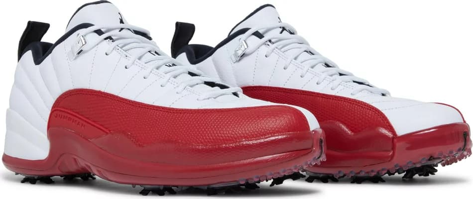 Кроссовки Air Jordan 12 Low Golf Cherry имеют белый кожаный верх с красными вставками на брызговике и красной мидсолью. Эти кроссовки созданы специально для игры в гольф и оснащены семью шипами под ногами, которые обеспечивают непревзойденное сцепление с поверхностью. Данная модель создана по мотивам баскетбольных OG AJ 12 Retro Cherry. В версии Golf используется полностью кожаная конструкция. Белая основа дополнена черным воротом, черными накладками и черными металлическими люверсами. Надпись Golf рядом с брендом Jumpman на стельке и на пятке завершает дизайн кроссовок.