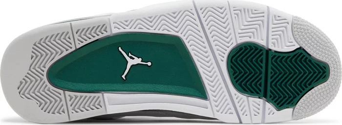 Модель кроссовок Air Jordan 4 Retro Oxidized Green представлена в белом кожаном верхе с тональной сеткой на четверти и серыми литыми люверсами. Контрастные зеленые акценты присутствуют на крыльях и задней панели, украшенных тисненым брендингом Jumpman. Второй логотип Jumpman украшает тканый язычок. Дополнительный зеленый цвет выделяет легкую полиуретановую промежуточную подошву с открытым блоком Air в пятке.