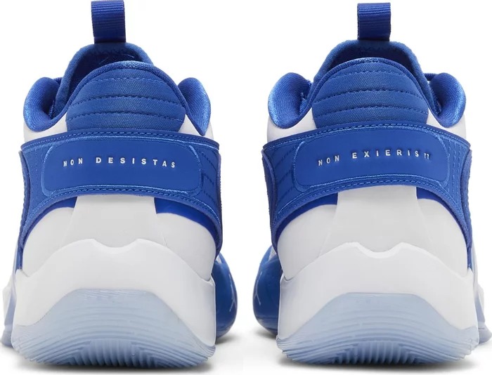 Верх кроссовок Air Jordan Luka 2 TB Game Royal состоит из бело-голубой искусственной кожи с сетчатой отделкой на носочной части и боковых панелях. На язычке красуется персональный логотип Луки, а на пятке - латинская фраза "Non Desistas, Non Exieris", что переводится как "Никогда не сдавайся, никогда не опускай руки". Легкая амортизация обеспечивается мидсолью, в которой используется пена Formula 23 от Jordan Brand, помещенная в твердый пенополиуретан. Резиновая подошва и боковая поверхность дополнены пластиной IsoPlate для повышения устойчивости.- Цвета: White/Game Royal/Pure Platinum