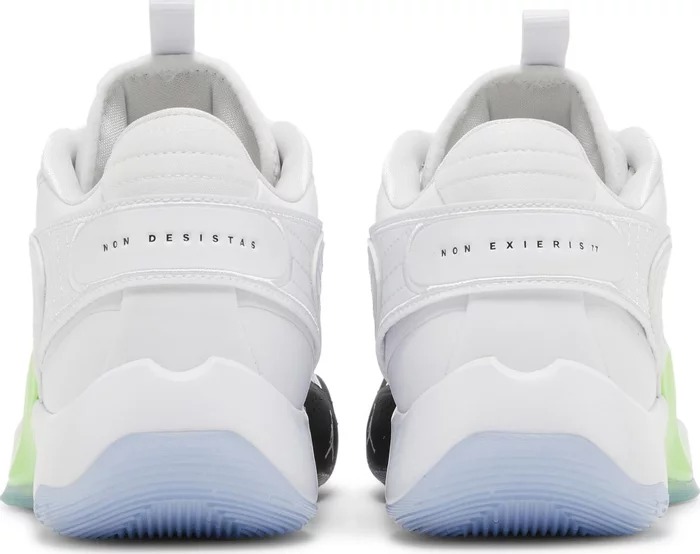 Вдохновленные привычкой Луки Дончича выполнять невероятные цирковые броски, Jordan Luka 2 "Trick Shot" украшают вторую фирменную обувь спортсмена НБА яркими флуоресцентными акцентами. Верх из белой искусственной кожи с сетчатой отделкой на носочной части и боковых панелях. На язычке красуется персональный логотип Луки, а на пятке - латинская фраза "Non Desistas, Non Exieris", что переводится как "Никогда не сдавайся, никогда не опускай руки". Легкая амортизация обеспечивается мидсолью, в которой используется пена Formula 23 от Jordan Brand, помещенная в твердый пенополиуретан. Резиновая подошва и боковая поверхность дополнены неоново-зеленой пластиной IsoPlate для повышения устойчивости.
